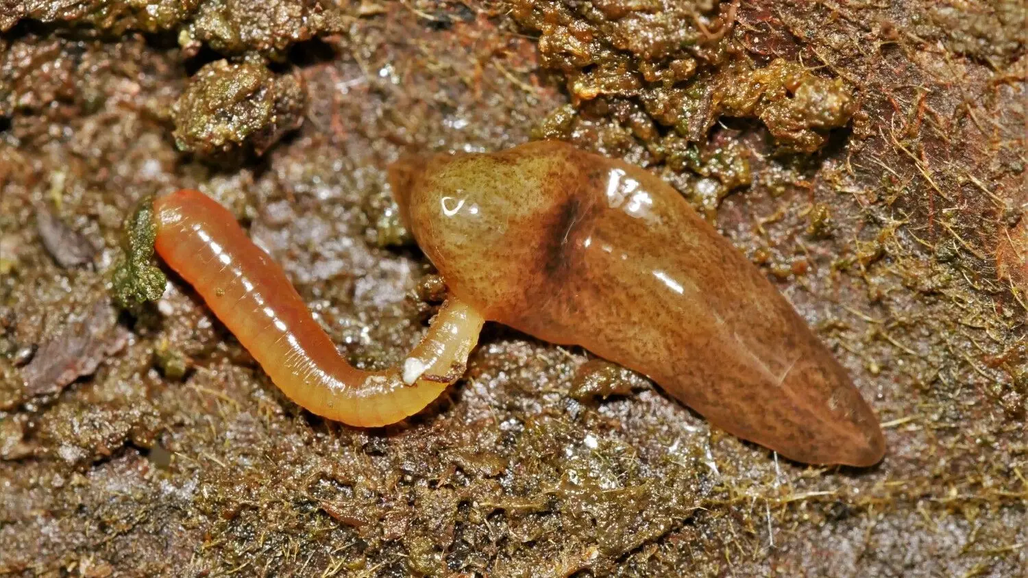Obama nungara, der schleimige Regenwurmkiller, wurde aus Südamerika eingeschleppt. Hier vertilgt er einen Regenwurm.