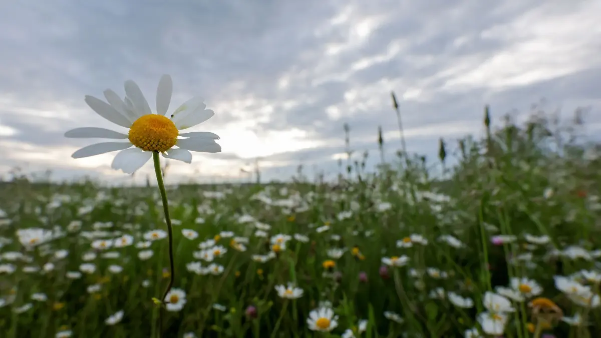 Eine Margerite (Leucanthemum) ragt aus einem Feld, während im Hintergrund der Himmel bewölkt ist.