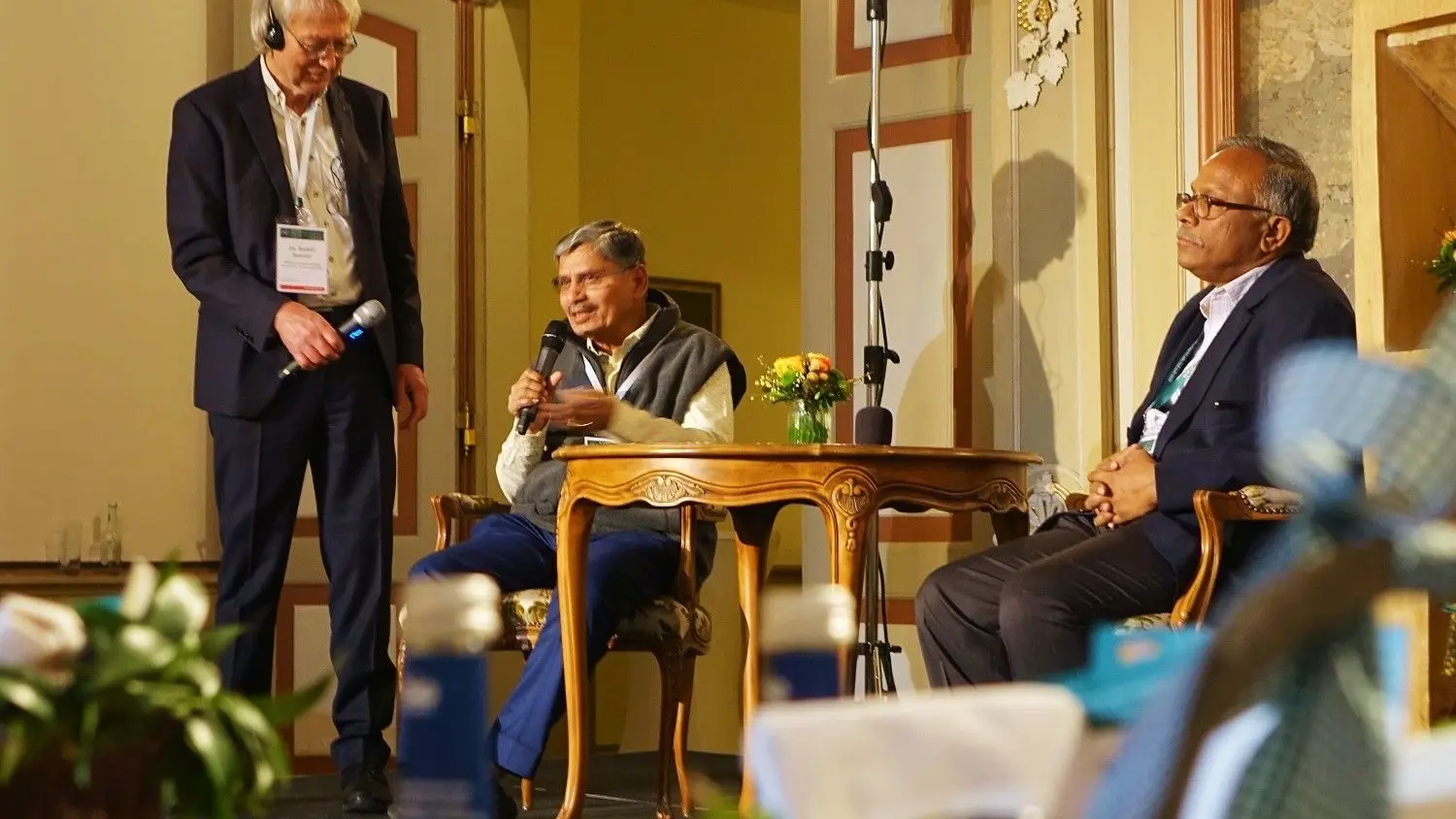 Dr. Malla Reddy (Zweiter von links) und Dr. Vijaya Kumar (rechts) haben den Teilnehmern des 3. World Organic Forum auf Schloss Kirchberg Rede und Antwort zum System des „Zero Budget Natural Farming“ gestanden. Die Diskussionsrunde hat Organisator Dr. Rudolf Buntzel moderiert.⇥