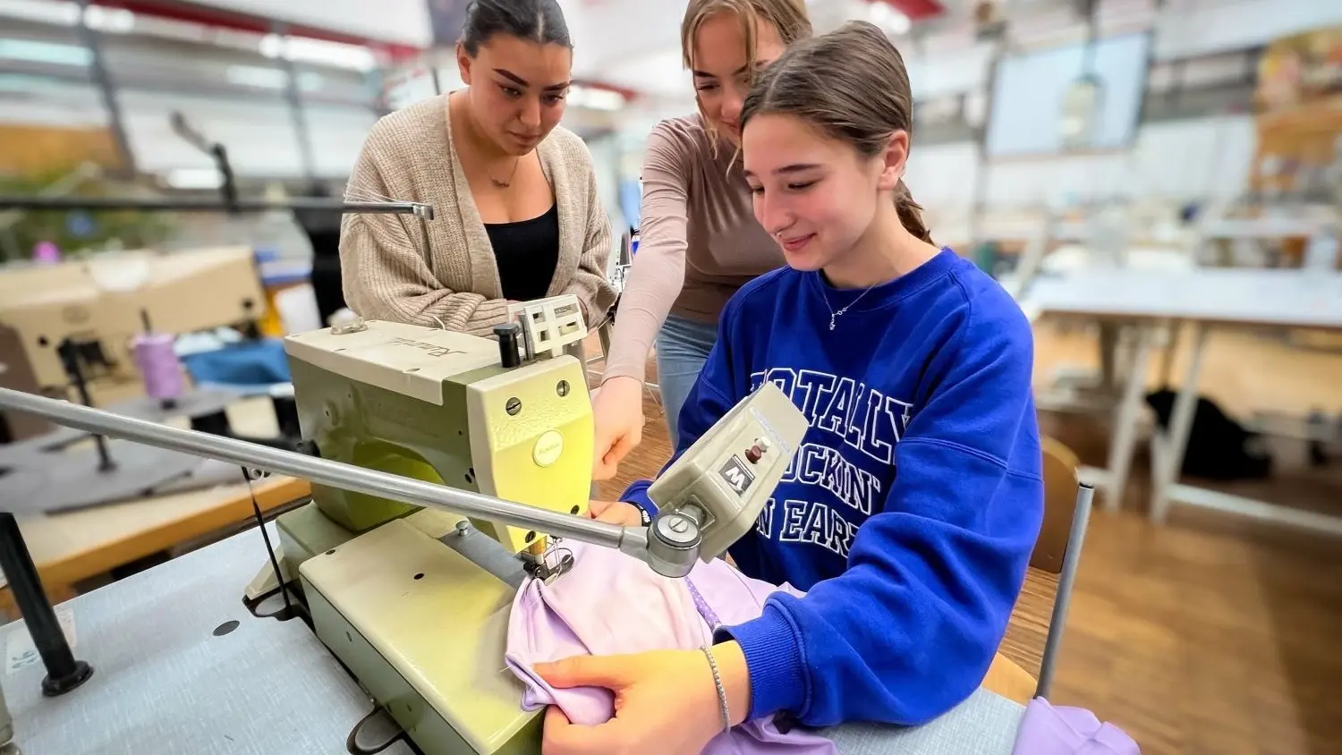 Schülerinnen der Vorbereitungsklasse nähen eine Babyhose. Von links: Berfin Kahraman, Elina Maier und Daria Caradjova.⇥