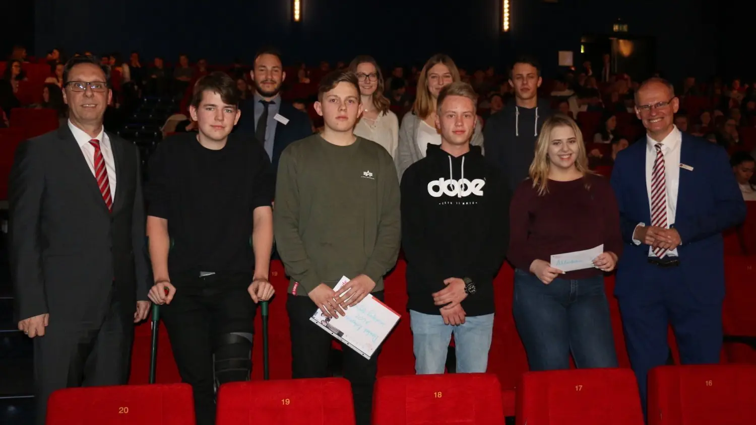 Die Gewinner des „Planspiel Börse“ der Sparkasse Schwäbisch Hall-Crailsheim mit Bereichsleiter Dieter Brenner (rechts) und Vorstandsmitglied Michael Beck (links).⇥