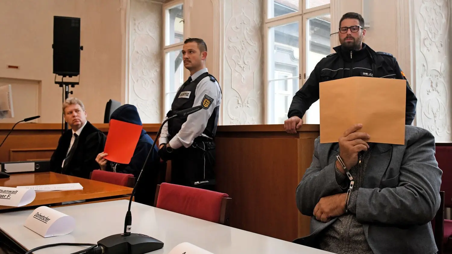 Der angeklagte Vater (rechts) sitzt mit gefesselten Händen auf der Anklagebank und hält sich einen Aktendeckel vor das Gesicht, links der Verteidiger mit einem der angeklagten Söhne (rote Akte).