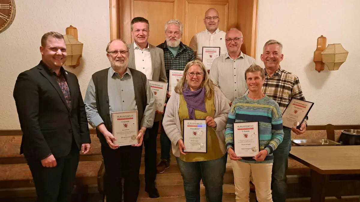 Bürgermeister Thomas Schelkle (links), neben dem Vorsitzenden des VfL Munderkingen Konrad Barth (Zweiter von links) und den anwesenden Geehrten.
