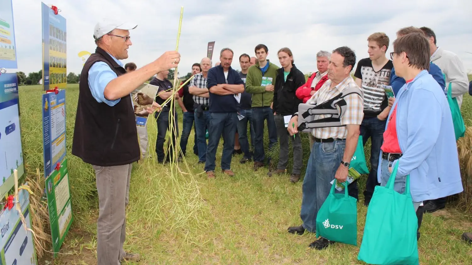 Ein Pflanzenschutzexperte erklärt bei den Feldtagen in Kleinallmerspann den Einsatz von Fungiziden (Stoffe, die Pilze oder ihre Sporen abtöten) und Wachstumsregulatoren beim Raps.