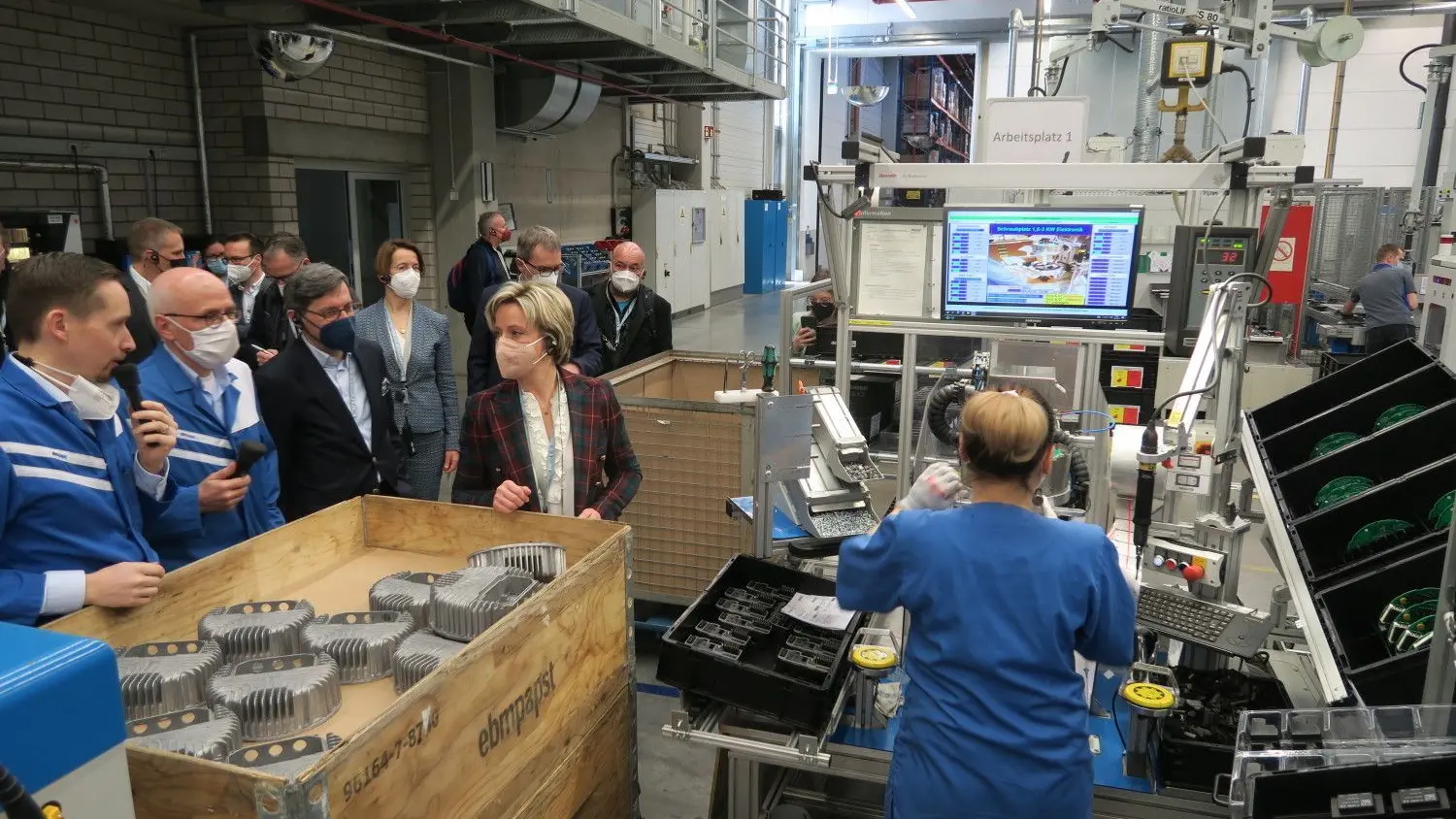 Nicole Hoffmeister-Kraut besucht EBM-Papst. Klaus Geißdörfer (Vorsitzender der Geschäftsführung, dunkler Anzug), Thomas Wagner (Gruppengeschäftsführer Produktion, links daneben, weiße Maske) und Matthias Jakob (Produktionsleiter in Hollenbach, mit Mikrofon) führen die Wirtschaftsministerin durchs Werk Hollenbach. ⇥