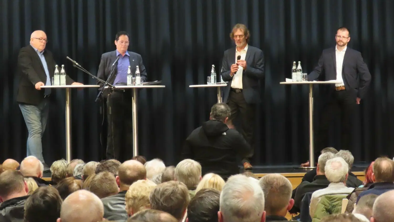 Robert Emil Vogelmann aus Hall (vorn) macht Stimmung gegen Asylsuchende. An den Tischen: Torsten Kunkel (Bürgermeister Pfedelbach), Jörg Holdt („Bürgerinitiative Pfedelbach“), Moderator Helmut Bauer und Mike Weise (Dezernent Hohenlohekreis).⇥
