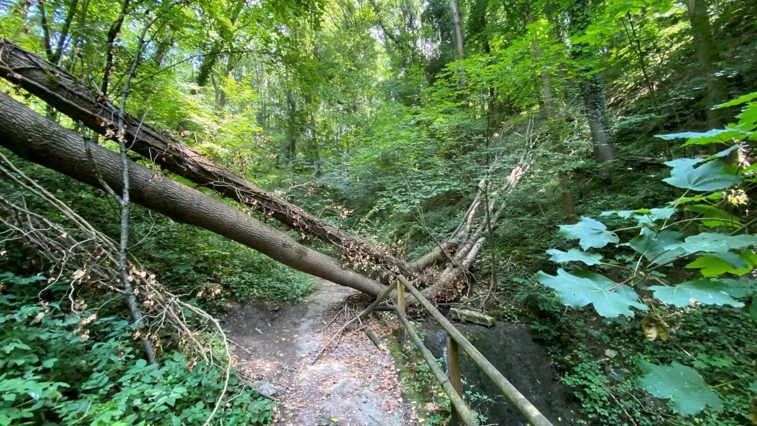 Über den Weg gekracht und das Geländer durchschlagen: Bäume in der Badersklinge versperren den Weg. Das Betreten der Strecke ist verboten.