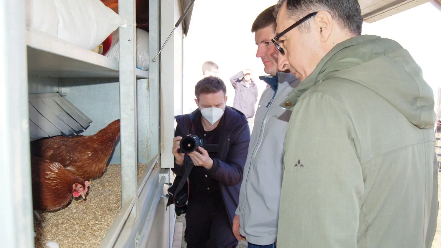 Der Bundesminister sieht bei Hermann Färber, wie Hightech auf dem Acker Pflanzenschutzmittel ersetzen kann und erfährt, welcher Fressfeind Freiland-Hennen bedroht. Es ist nicht der Fuchs.