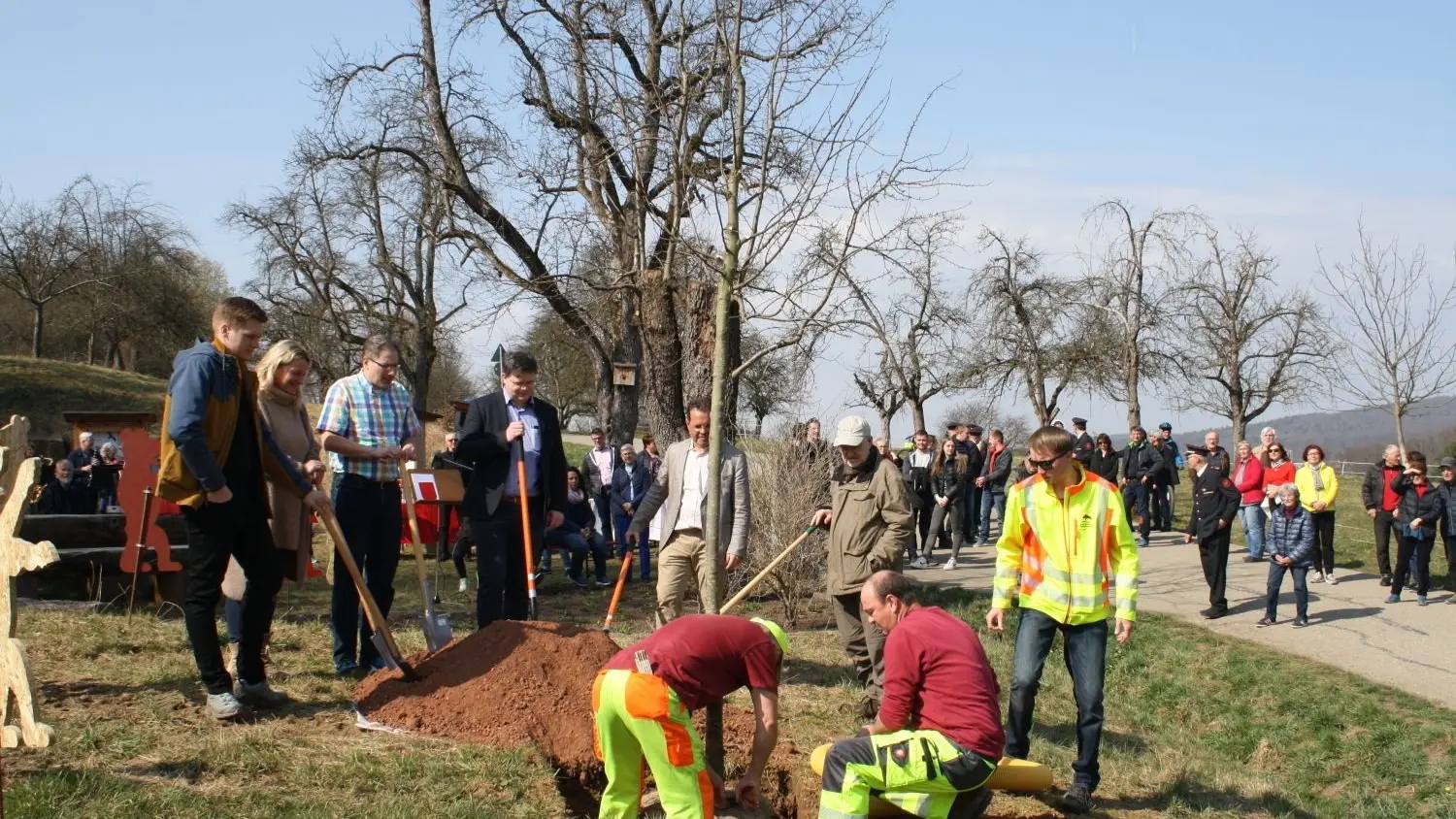 Beim Baumpflanzen von links: Pfarrer Dietmar Winter, Ortsvorsteherin Bettina Maschke aus Weiler ob Helfenstein, der Hochdorfer Bürgermeister Gerhard Kuttler, Ebersbachs Bürgermeister Eberhard Keller, Ortsvorsteher Oliver Knur von Ebersbach-Weiler, Wanderexperte Dieter Buck, im Vordergrund Mitarbeiter des Bauhof Ebersbach.