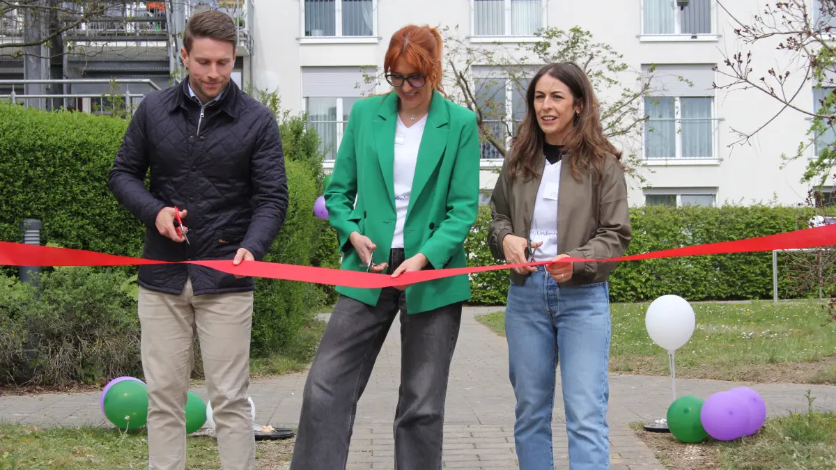Bürgermeister Dennis Eberle, Heimleiterin Bettina Arlt und Seniorenreferentin Carolin Bahr haben mit dem feierlichen Durchschnitt des Bandes den Bewegungsparcours eröffnet (von links).