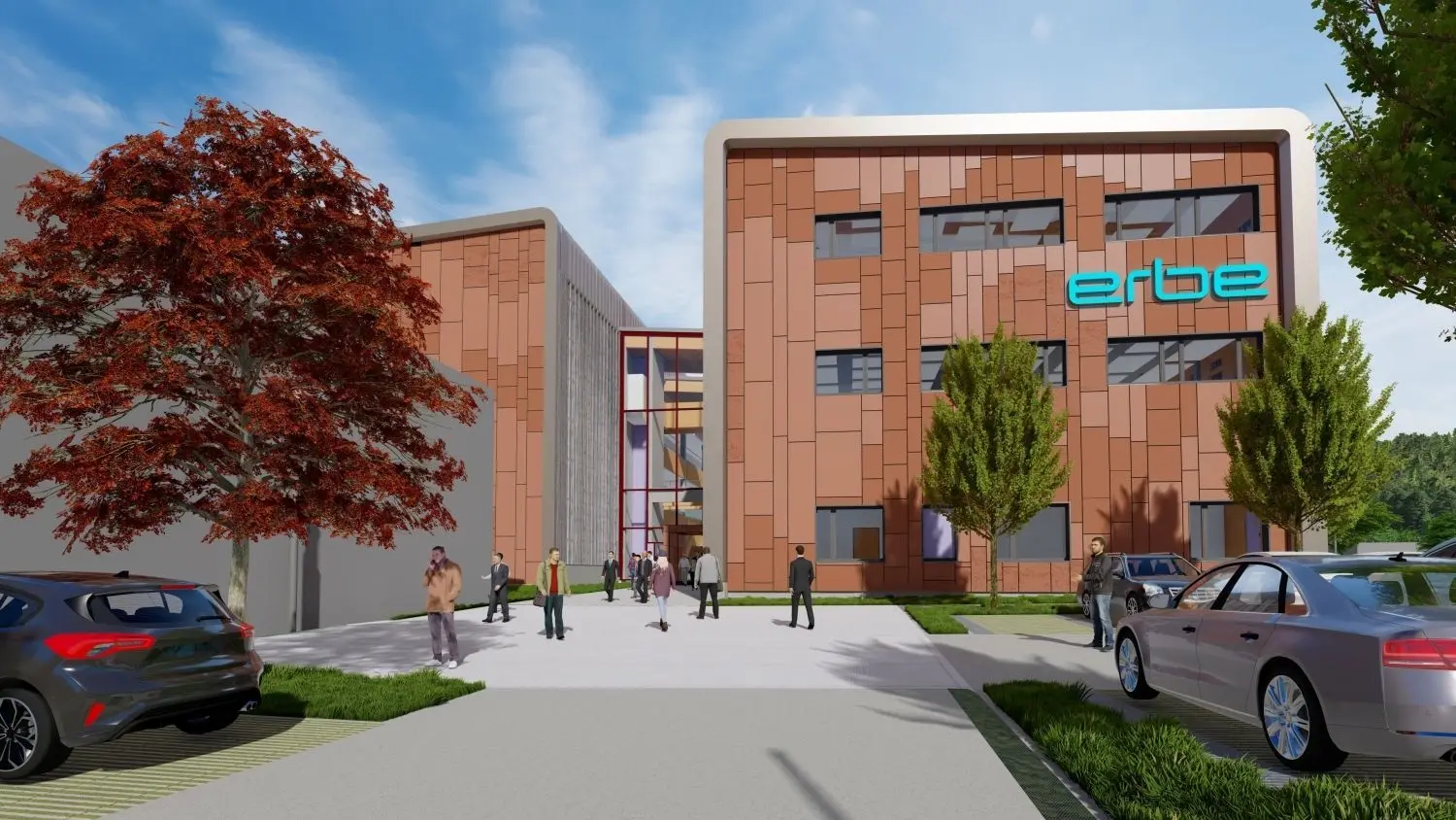 Neue Visualisierung: der Blick auf den Haupteingang des zukünftigen Produktionsstandorts von Erbe in Rangendingen.⇥