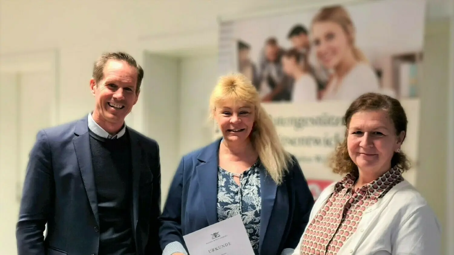 Schulamtsleiter Stefan Hipp überreichte zusammen mit Nicole Breitling vom RP Tübingen der neuen Rektorin Ulrike Wolf (Mitte) die Ernennungsurkunde.