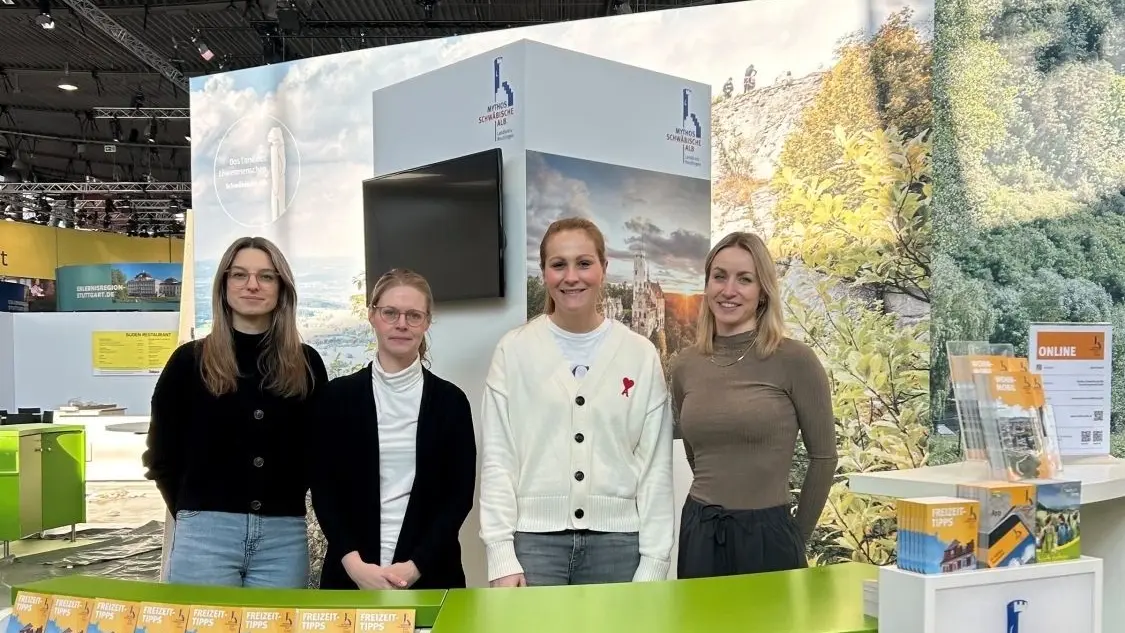 Mythos-Geschäftsführerin Sarah Reinhardt (dritte von links) zusammen mit ihrem Team. Am Freitag bauten sie den Stand der Tourismusgemeinschaft im Landkreis Reutlingen auf der CMT auf. ⇥