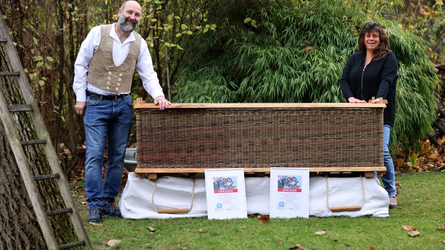 Bestatter und Schreinermeister Uwe Serway und Korbmachermeisterin Monika Frischknecht haben mit ihrem Sarg aus Naturmaterialien den Sonderpreis der Handwerkerstiftung der Kreissparkasse gewonnen.⇥