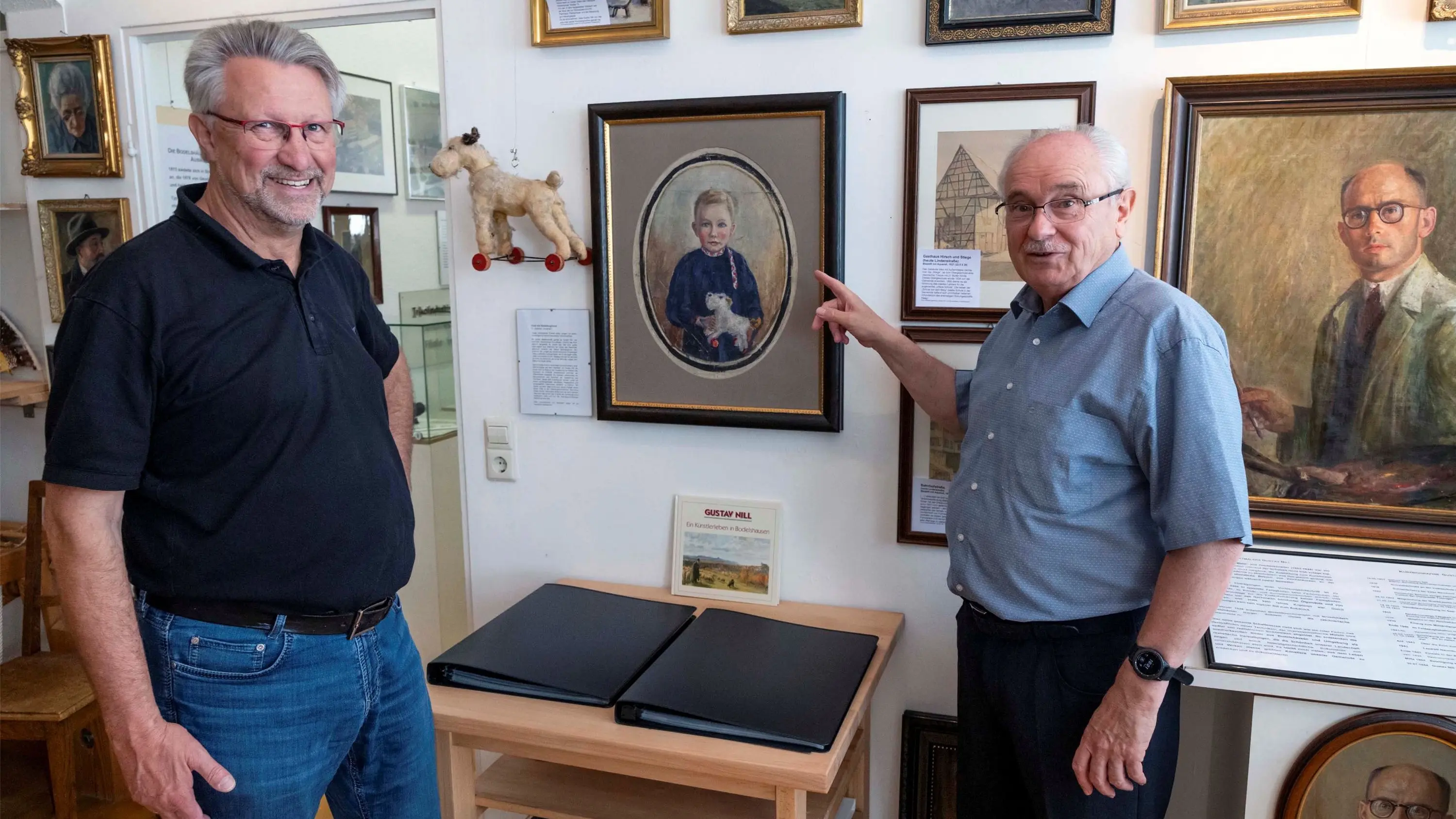 Wechsel an der Spitze des Bodelshäuser Heimatmuseums: Für Kurt Lacher übernimmt Rainer Habe die Leitung. In der Mitte die Neuerwerbung, ein Bild des lokalen Malers Gustav Nill, Kind mit Spielzeughund.