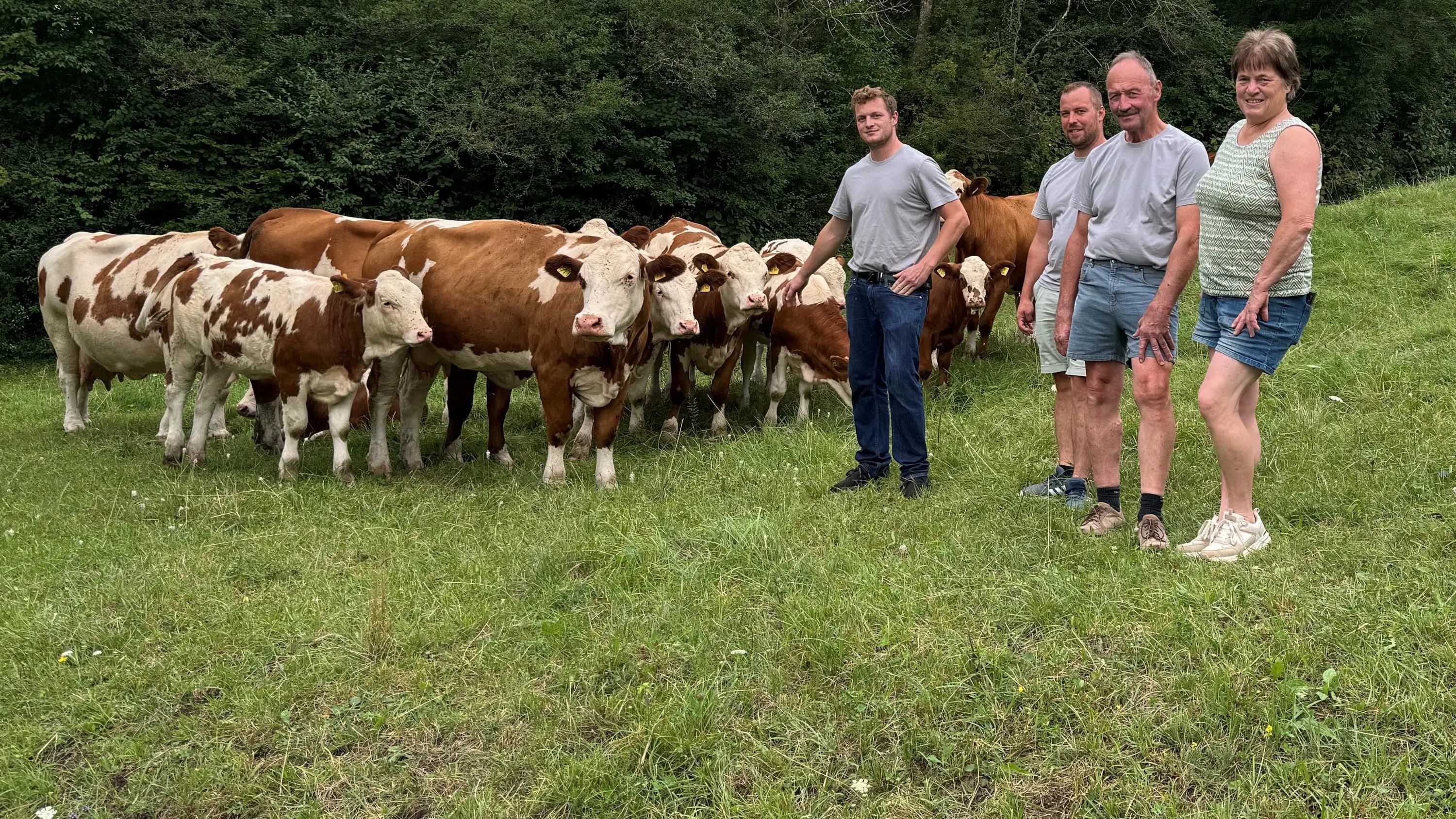 Sie setzen auf Muttertierhaltung: Von links: Florian Rein, Metzgermeister Tobias Kern, Hartmut und Susanne Rein. Die Kuhherde grast am Rande des Öschinger Hangrutsches.