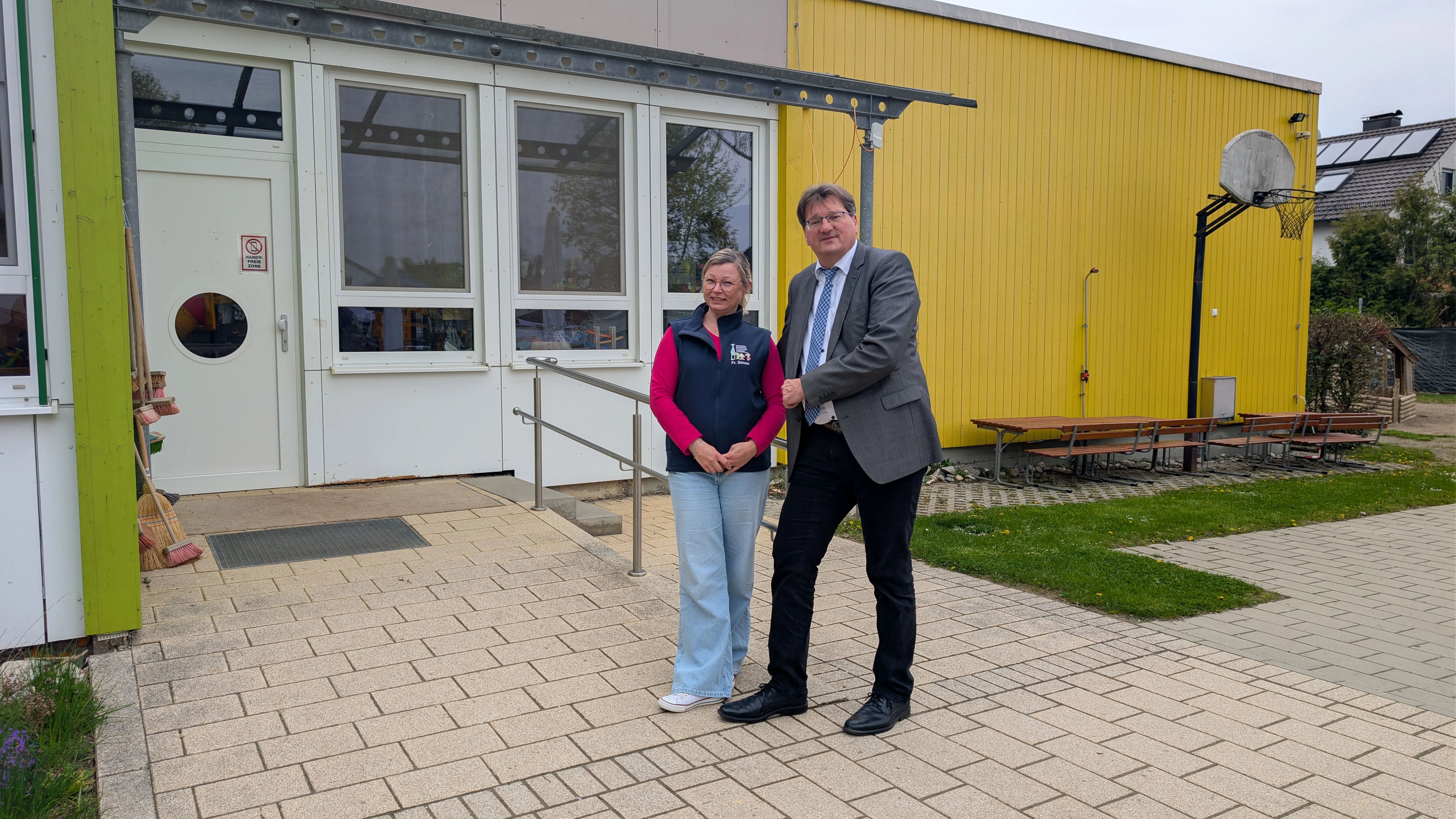 Elchingens scheidender Bürgermeister Joachim Eisenkolb an künftiger Wirkungsstätte: Im Thalfinger Kindergarten, rechts dessen Leiterin Monika Simon, wird er künftig vorlesen.