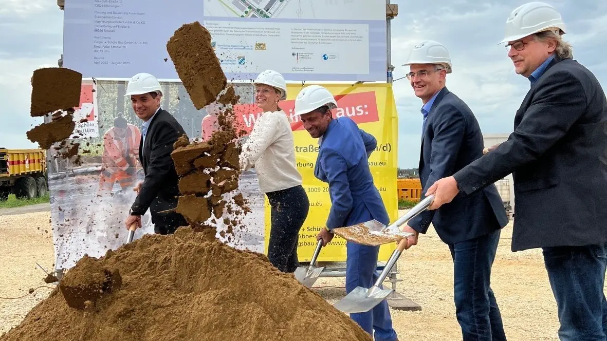 Und los geht’s: Oberbürgermeisterin Katrin Albsteiger sowie Vertreter von Partnern, Behörden und Unternehmen machen den symbolischen ersten Spatenstich für das Wohngebiet „Am Illerpark“.