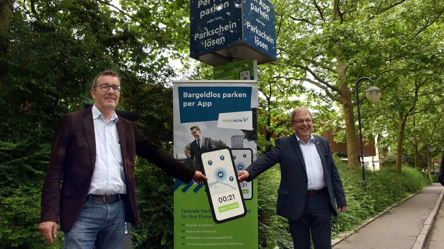 Auf städtischen Parkplätzen kann man nun digital bezahlen: Oberbürgermeister Thomas Keck und Peter Wilke, Leiter des Amts für Wirtschaft und Immobilien (links) freuen sich über den Start.