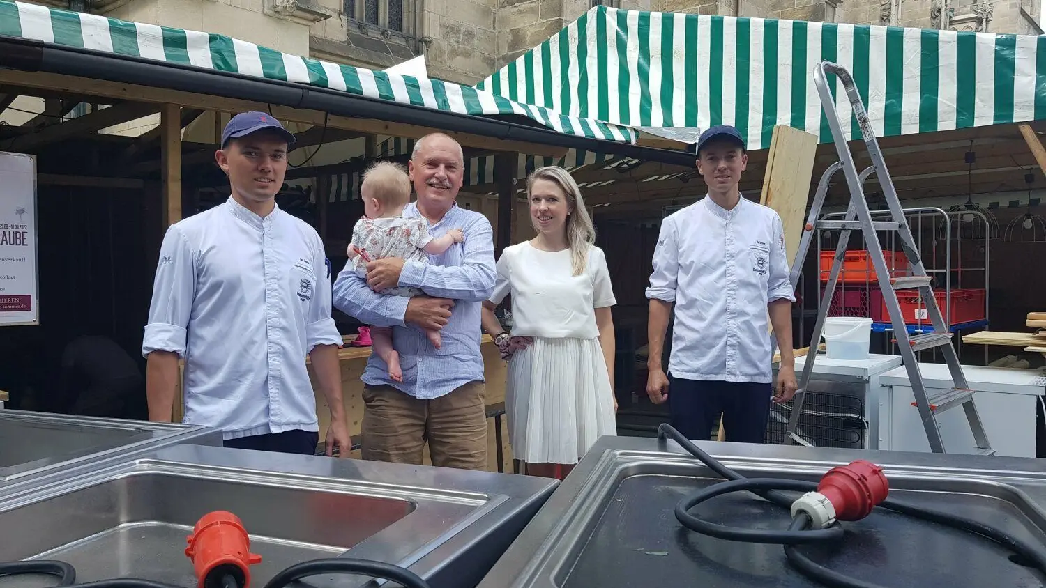 Familienbetrieb in vierter Generation: Inhaber Andreas Sommer (mit Enkelin Lilli) und seinen erwachsenen Kindern Carl, Anja und Paul (von links nach rechts), die ebenfalls im Café Sommer tätig sind. Das Interims-Café entsteht derzeit an der Marienkirche.⇥