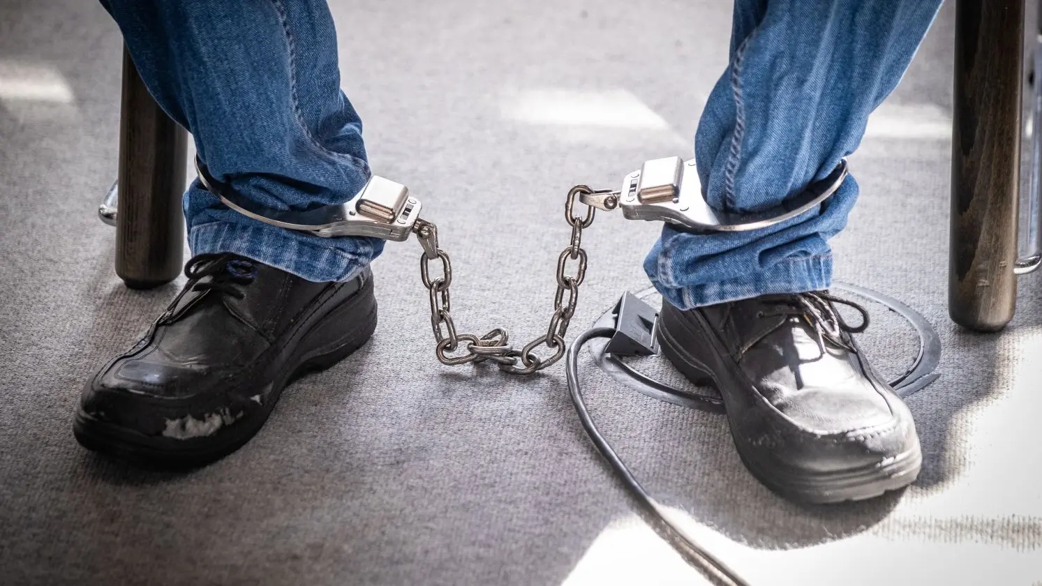 In Handschellen mit Fußfesseln wurde Adrian S. an jedem der sieben Sitzungstage in den Saal geführt. Während die Handschellen zu Beginn der Verhandlung abgenommen wurden, blieben die Füße gefesselt.⇥