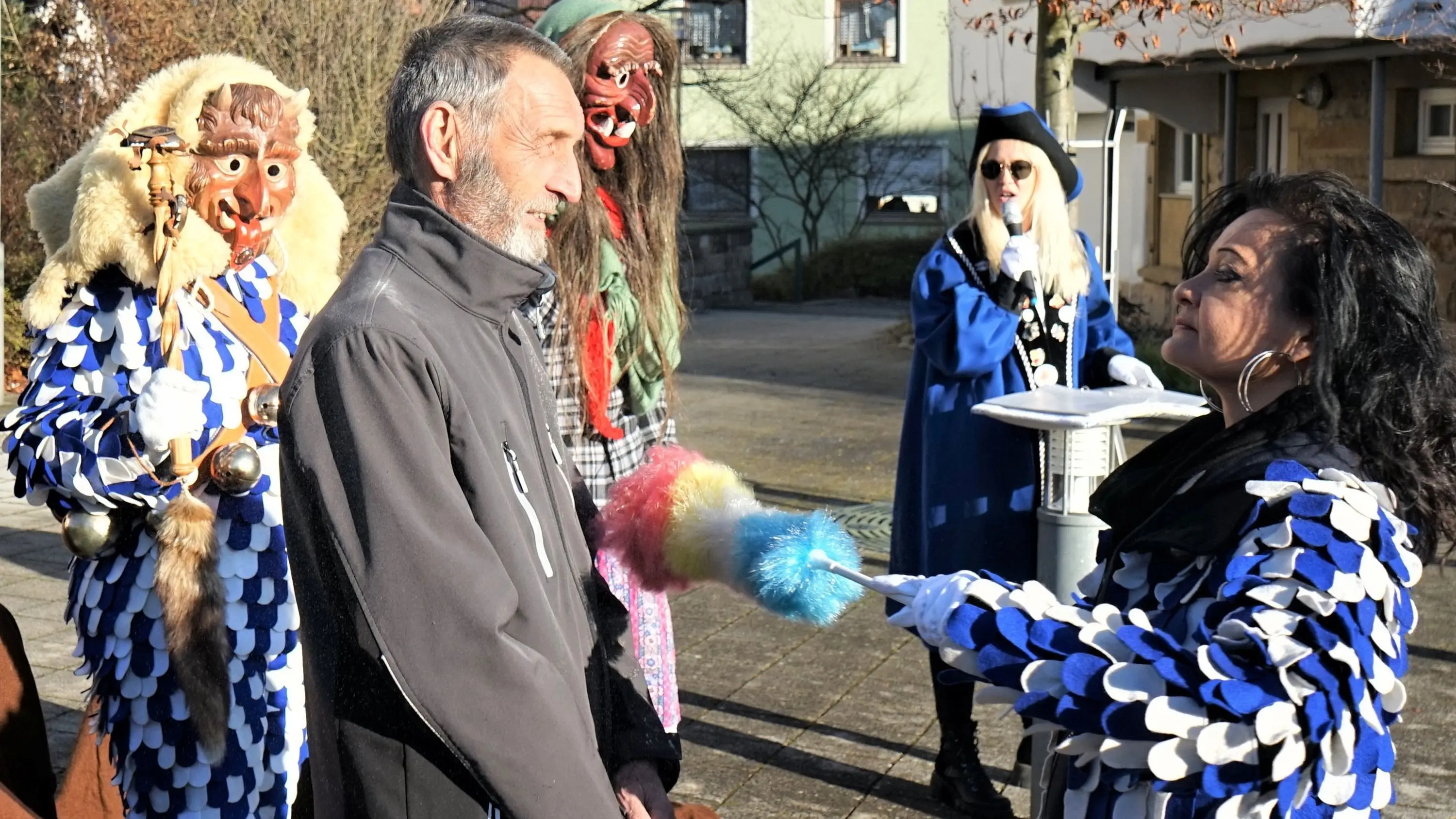 Mit einem Staubwedel gingen die Altinger Narren ans Werk, moderiert von Zeremonienmeisterin Vanessa Norz (mit Hut).