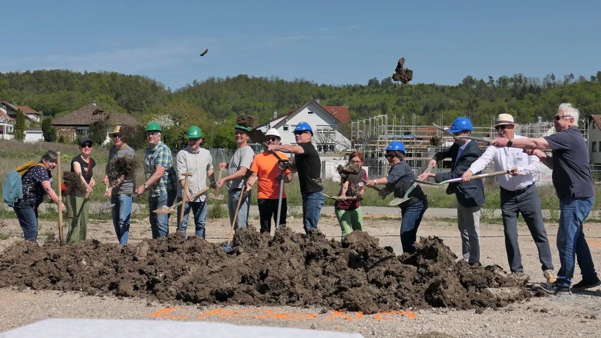 Der Erdhaufen stammte zwar in Wirklichkeit von der benachbarten Baustelle, dem Engagement beim Spatenstich im Entringer Schlossblick tat das aber keinen Abbruch.