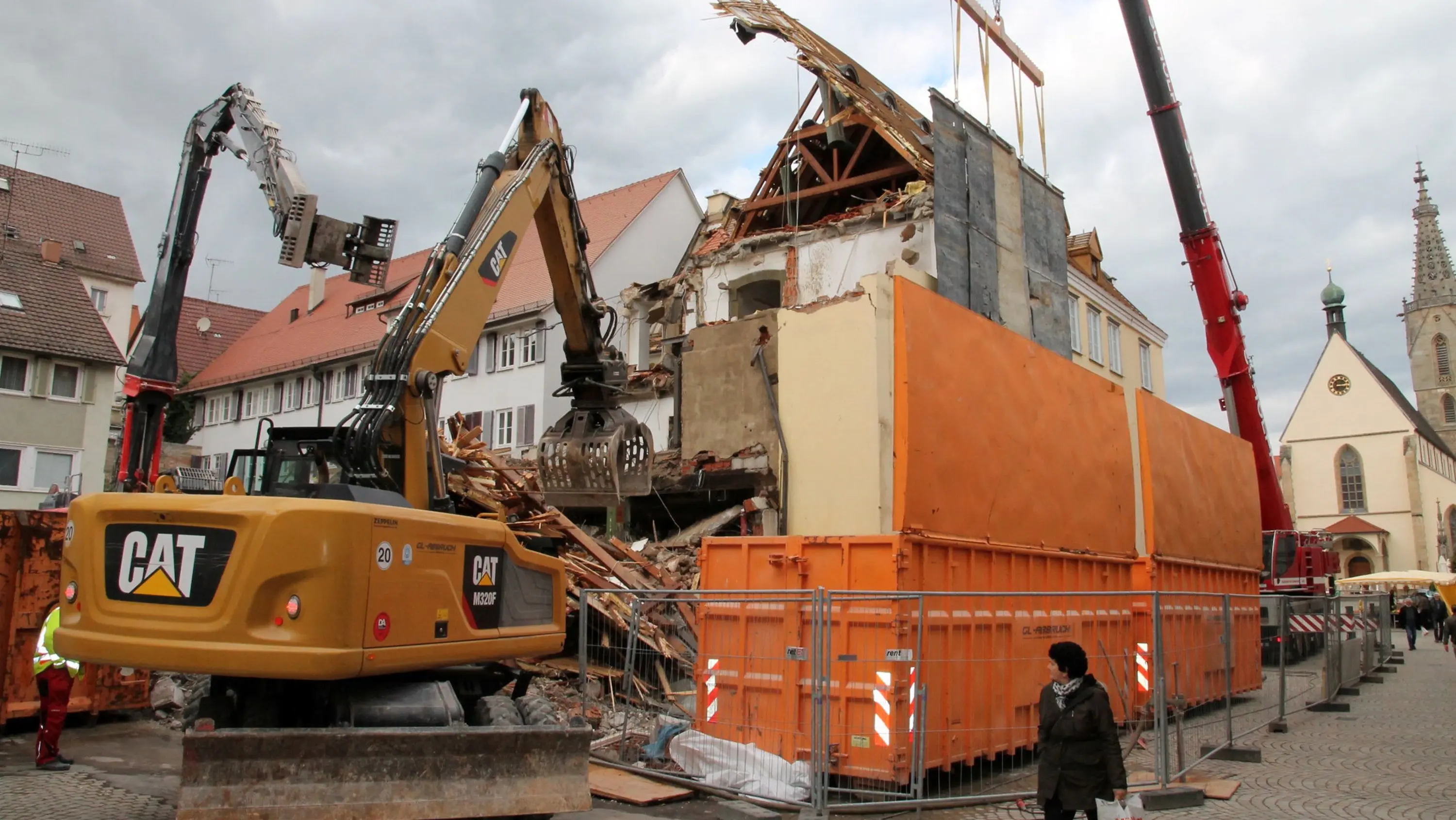 Ein 60 Tonnen schwerer Longfront-Bagger (hinten im Bild) nagt seit Dienstagmorgen auch am Hauptgebäude der früheren Kreissparkasse am Rottenburger Marktplatz.