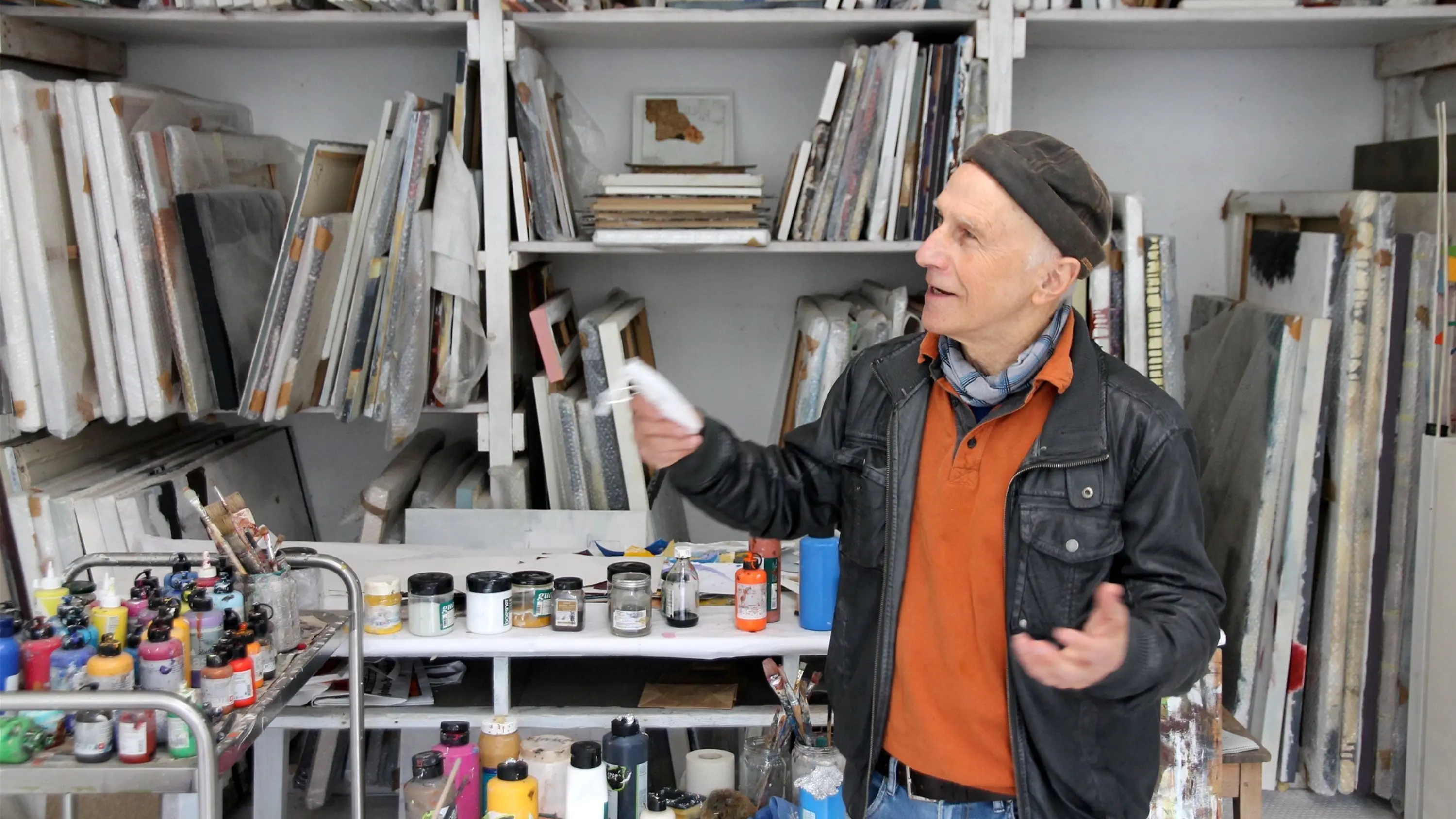 Umgeben von Farbtuben, Pinseln und gesammelten Werken: Herbert Schmidt in seinem Atelier im Rottenburger Künstlerhof. Bilder: Philipp Koebnik