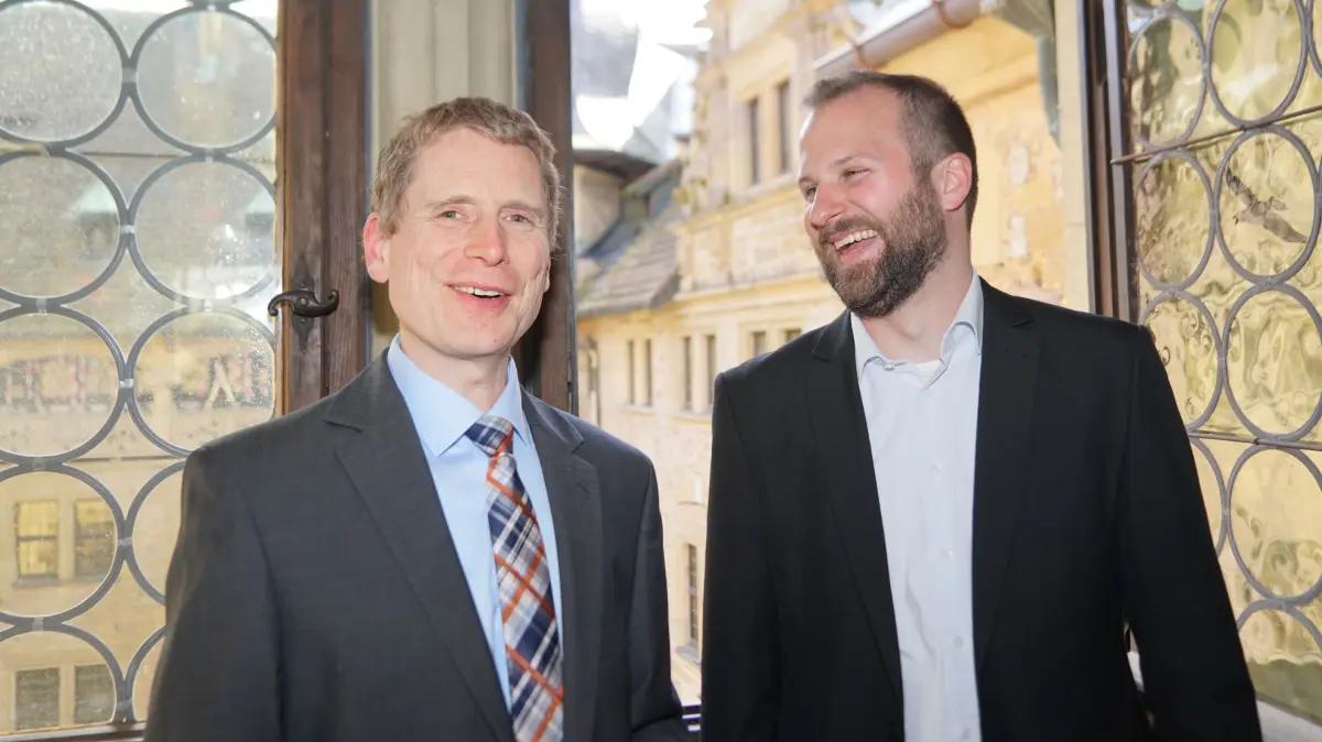 Der „Alte“ und der „Neue“ verstehen sich gut: Ulrich Schludi (rechts) und sein Nachfolger Florian Schreiber beim offiziellen Empfang zum Abschied des langjährigen Chefs im Lesesaal des Hohenlohe-Zentralarchivs auf Schloss Neuenstein.