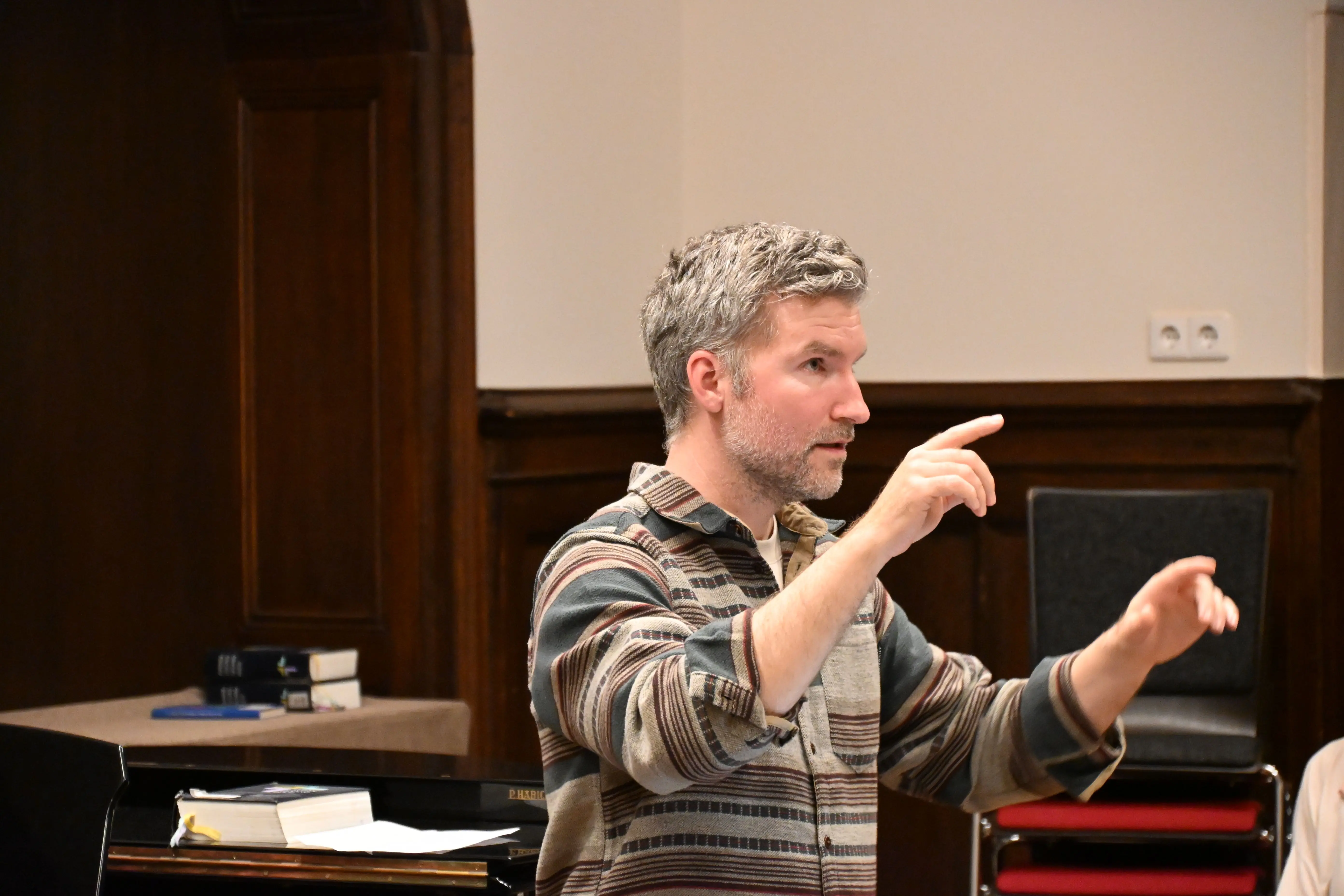 Chorleiter Julian Knörzer bei der Probe im Saal der Kirchenmusikhochschule