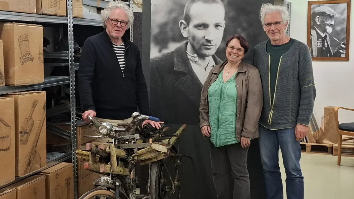 Flugräder, kistenweise Kunst und Instrumente, dazu alte Fotos: Stefan Hartmaier, Ruth Setzler und Franz Xaver Ott (von links) im Gustav-Mesmer-Archiv in Kirchentellinsfurt.