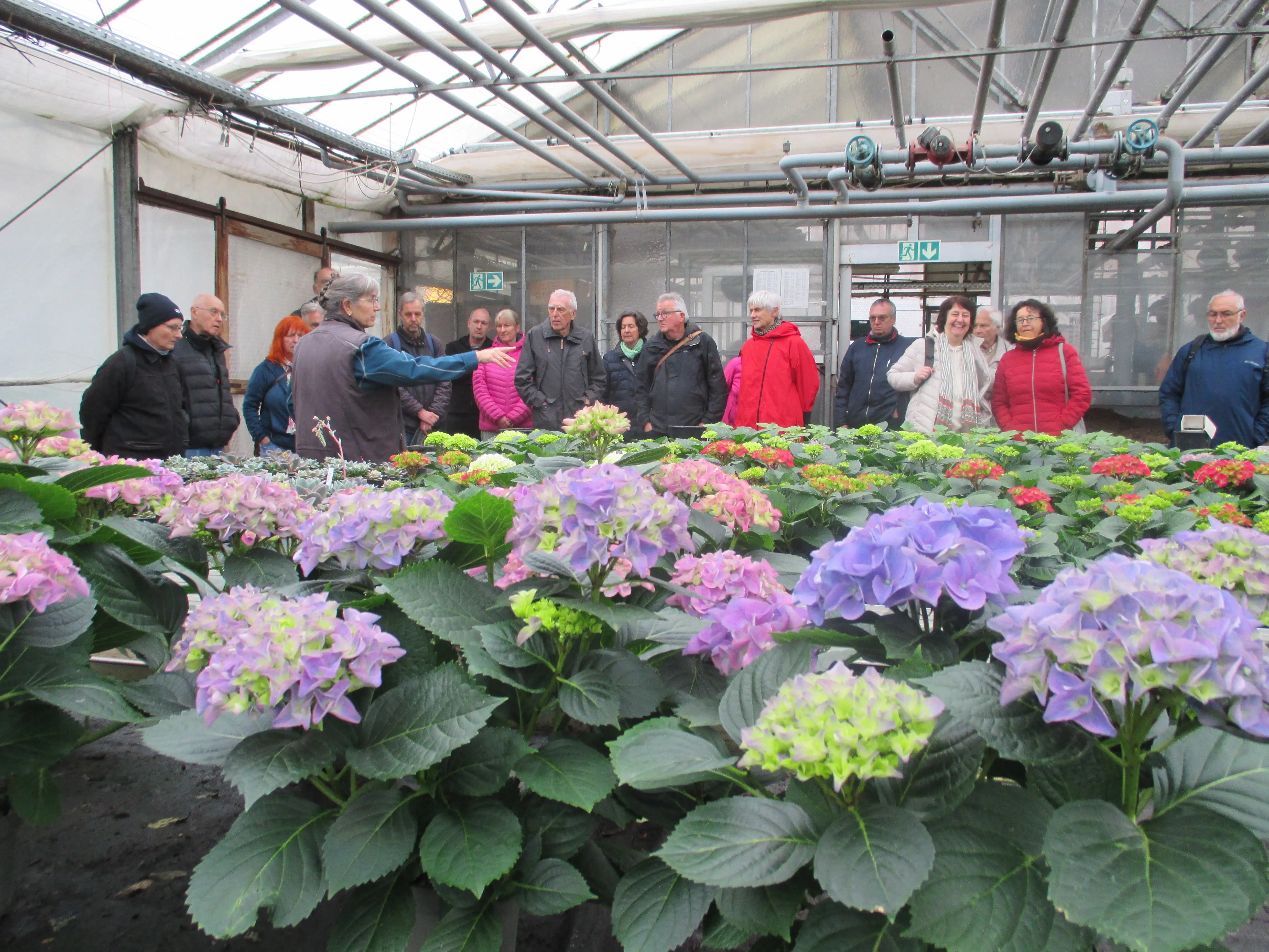 Gisela Thoma, Leiterin der Gärtnerei St. Moritz, zeigt den Teilnehmern einer Führung die verschiedenen Entwicklungsstadien der Hortensien.