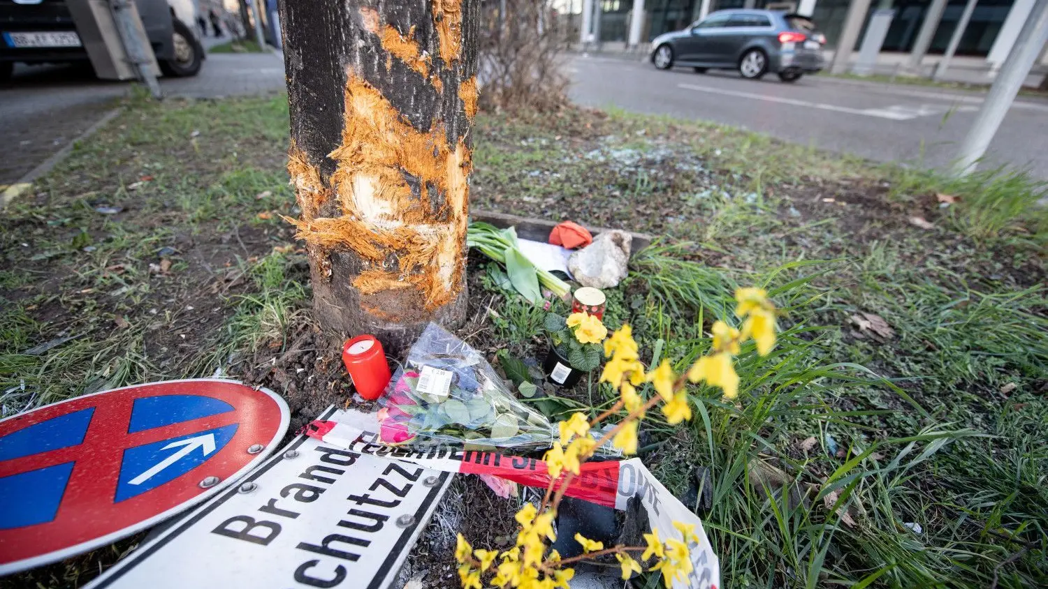 Verbogene Verkehrssschilder und eine Trauernachricht liegen an der Unfallstelle in der Rosensteinstraße in Stuttgart.