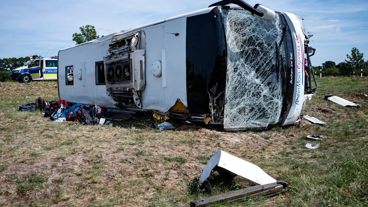 Fabian Sommer / DPA- Unfall: Auf der Autobahn 13 bei Schönwald (Brandenburg) hat sich, am Freitag, 30.07.2021, um etwa 10 Uhr ein Reisebus überschlagen.