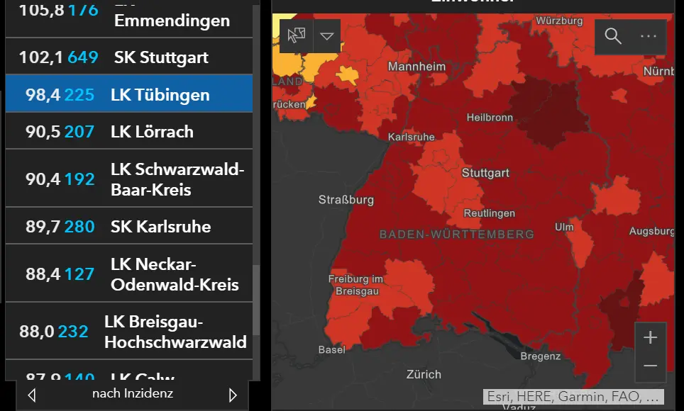 Mittlerweile hat die Hälfte der 44 Stadt- und Landkreise die Marke 100 überschritten. Vier Kreise liegen sogar über 200. Der Kreis Schwäbisch Hall hat mit einer Inzidenz von 375,1 mit Abstand die höchsten Fallzahlen. Darauf folgen der Hohenlohekreis mit 224,6, Sigmaringen mit 208,6 und der Main-Tauber-Kreis mit 200,2. Kein einziger Kreis liegt mehr unter 50.