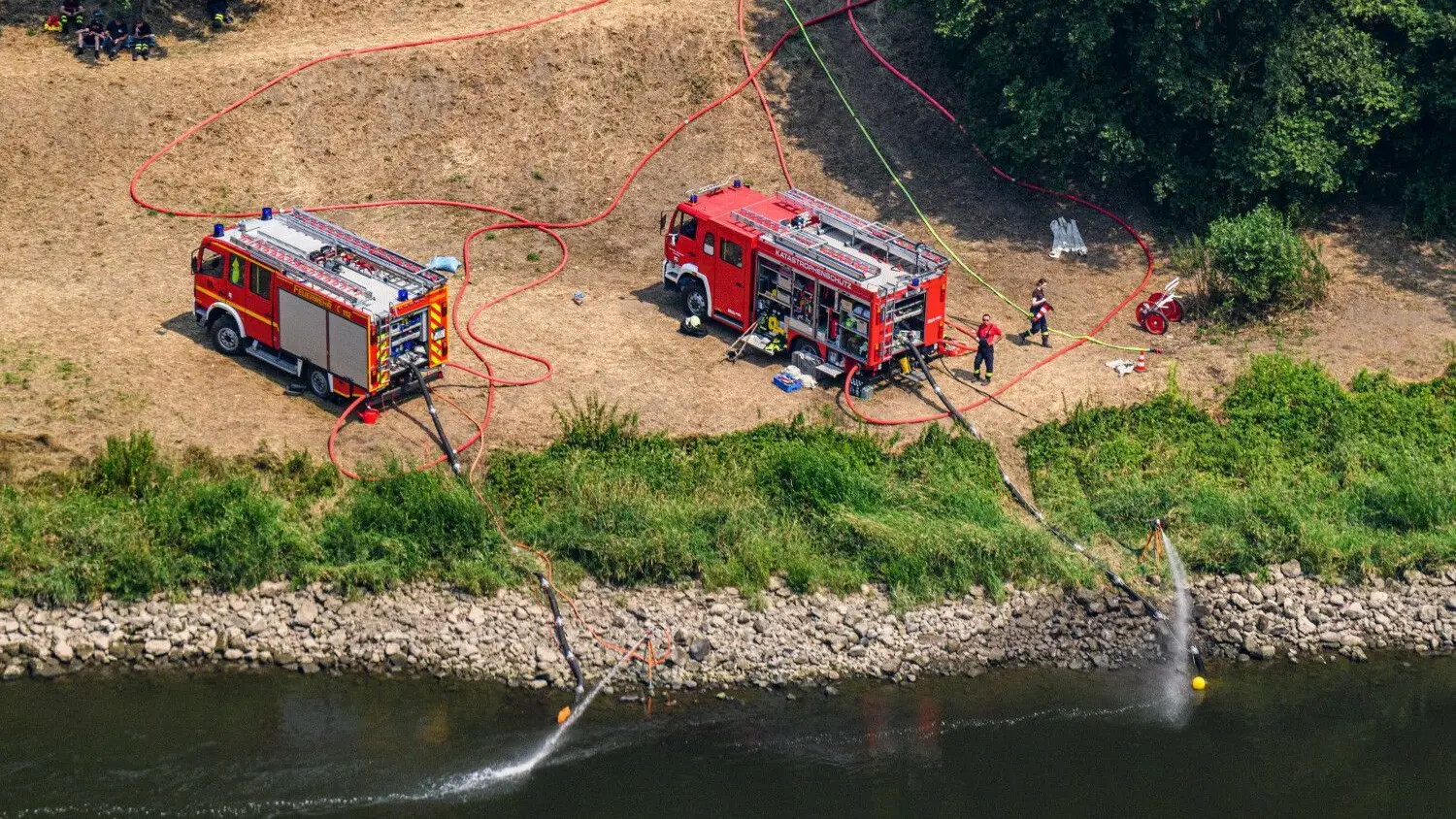 Feuerwehren pumpen Wasser aus der Elbe um einen Waldbrand im Nationalpark Sächsische Schweiz zu löschen.