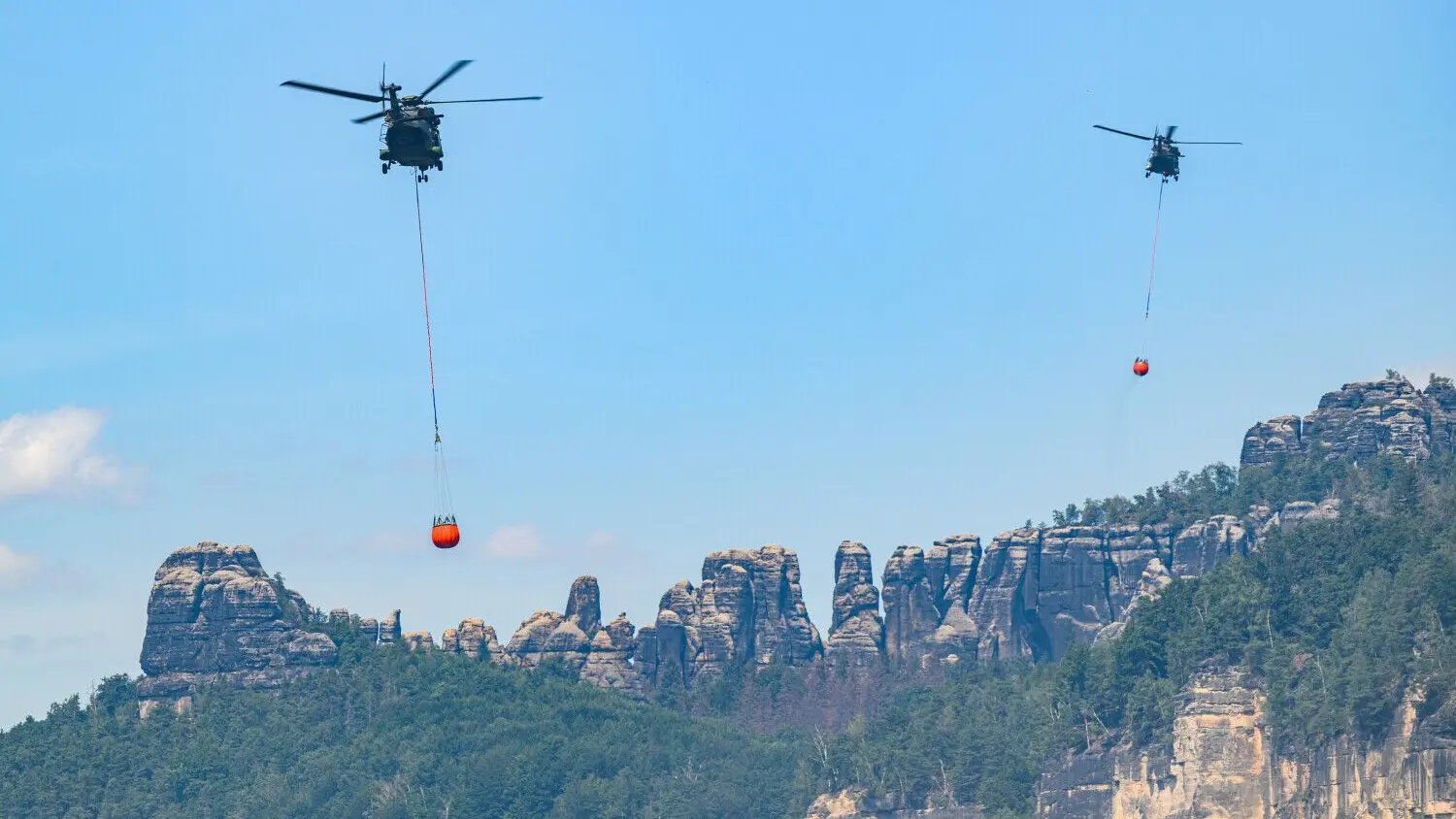 Hubschrauber der Bundeswehr fliegen mit Löschwasser-Außenlastbehältern um einen Waldbrand im Nationalpark Sächsische Schweiz zu löschen.