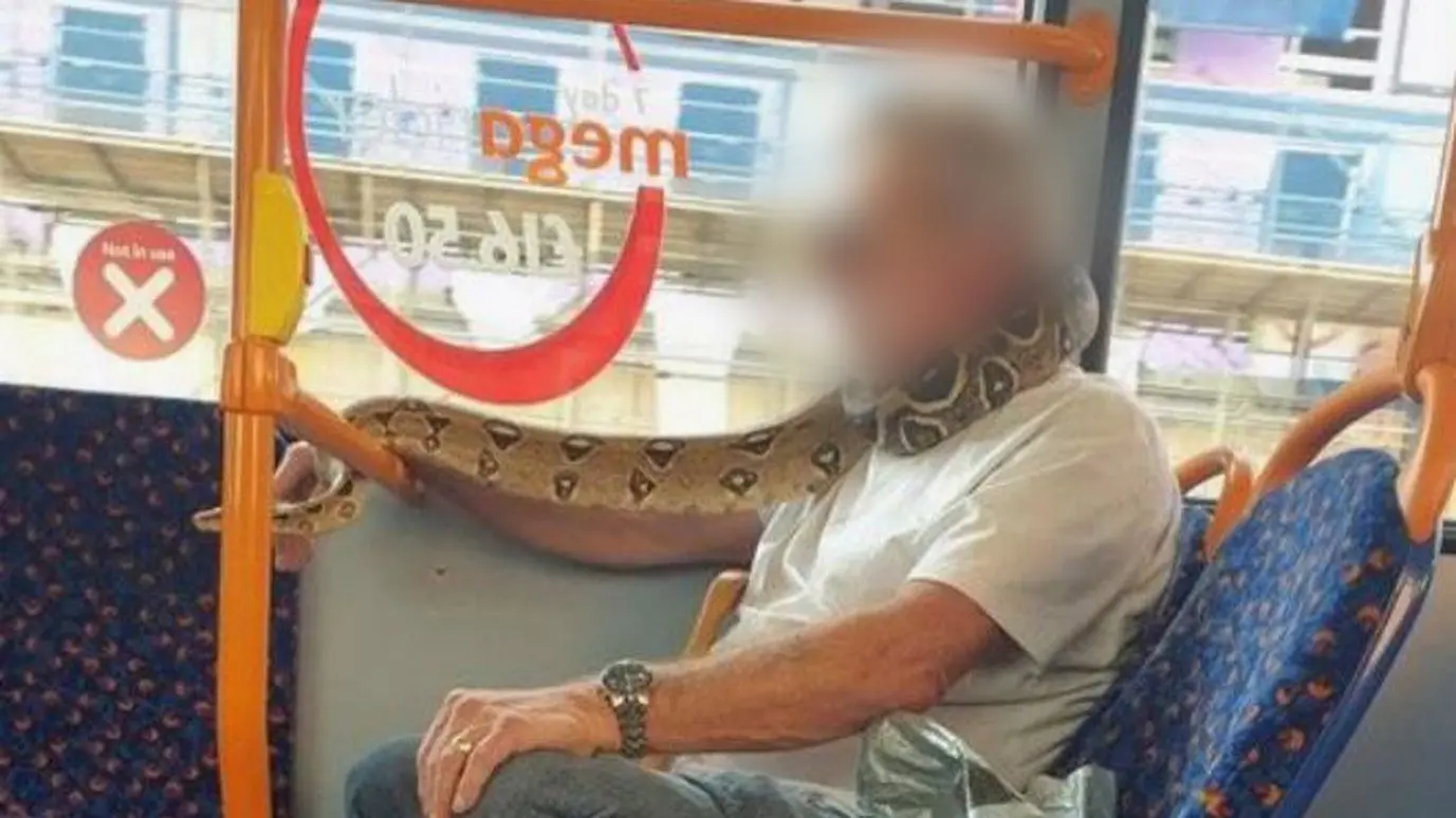 Mit einer Schlange um den Hals sitzt ein Mann in Manchester im Bus. Das Tier nutzt er als Maskenersatz.