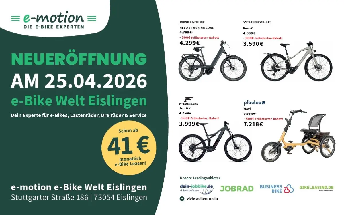 Mit der Neueröffnung setzt die „e-motion e-bike Welt“ in Eislingen ein klares Zeichen für zukunftsorientierte und nachhaltige Mobilität in der Region. Interessierte sind herzlich eingeladen, den neuen Standort zu besuchen, die Vielfalt moderner E-Bikes zu entdecken und sich persönlich beraten zu lassen.