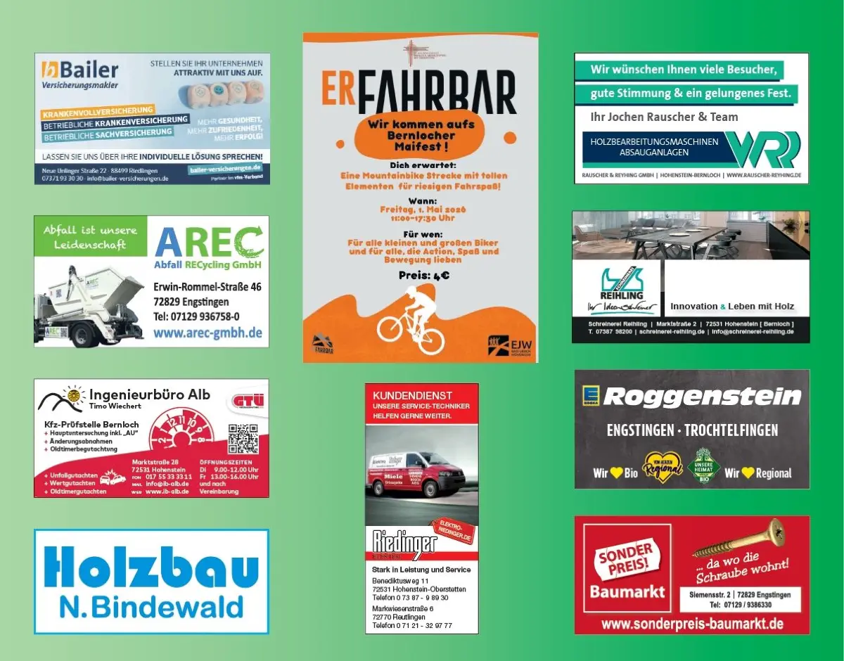 Das diesjährige Maifest erhält am Freitag, 1. Mai, Besuch: Das Projekt „erFAHRBAR“ des Evangelischen Jugendwerks Bad Urach-Münsingen präsentiert in Kooperation mit der Kirchengemeinde Bernloch eine mobile Fahrradstrecke, die mit einer Vielzahl abwechslungsreicher Elemente zum Mitmachen einlädt. Kinder, Jugendliche und Erwachsene sind herzlich willkommen, die Strecke zu erkunden, ihre Fahrkünste zu erproben und dabei pure Freude auf zwei Rädern zu erleben. Die mobile Fahrradstrecke von „erFAHRBAR“ hat es in sich: Mit eigens konstruierten Elementen wie Tables, Steilkurven und Rollern bietet sie für jeden etwas. Egal, ob man gerade erst das Radfahren lernt oder schon Erfahrungen aus dem Bikesport mitbringt, hier kommt jeder auf seine Kosten. Die Strecke macht einfach Lust, Neues auszuprobieren und das Fahren auf zwei Rädern von einer ganz neuen Seite zu erleben. Die Teilnahme an der Fahrradstrecke kostet vier Euro für fünf Runden, inklusive der Nutzung von Leihfahrrädern, die vom Betreiber gestellt werden. Wer möchte, kann natürlich auch sein eigenes Rad mitbringen. Da die Strecke nicht wetterfest ist, findet das Angebot nur bei trockenem Wetter statt. Der Parcours wird in unmittelbarer Nähe zum Festzelt aufgebaut, sodass die Besucher des Maifests bequem zwischen den Attraktionen wechseln können. Die Strecke ist von 11 bis 17.30 Uhr geöffnet.