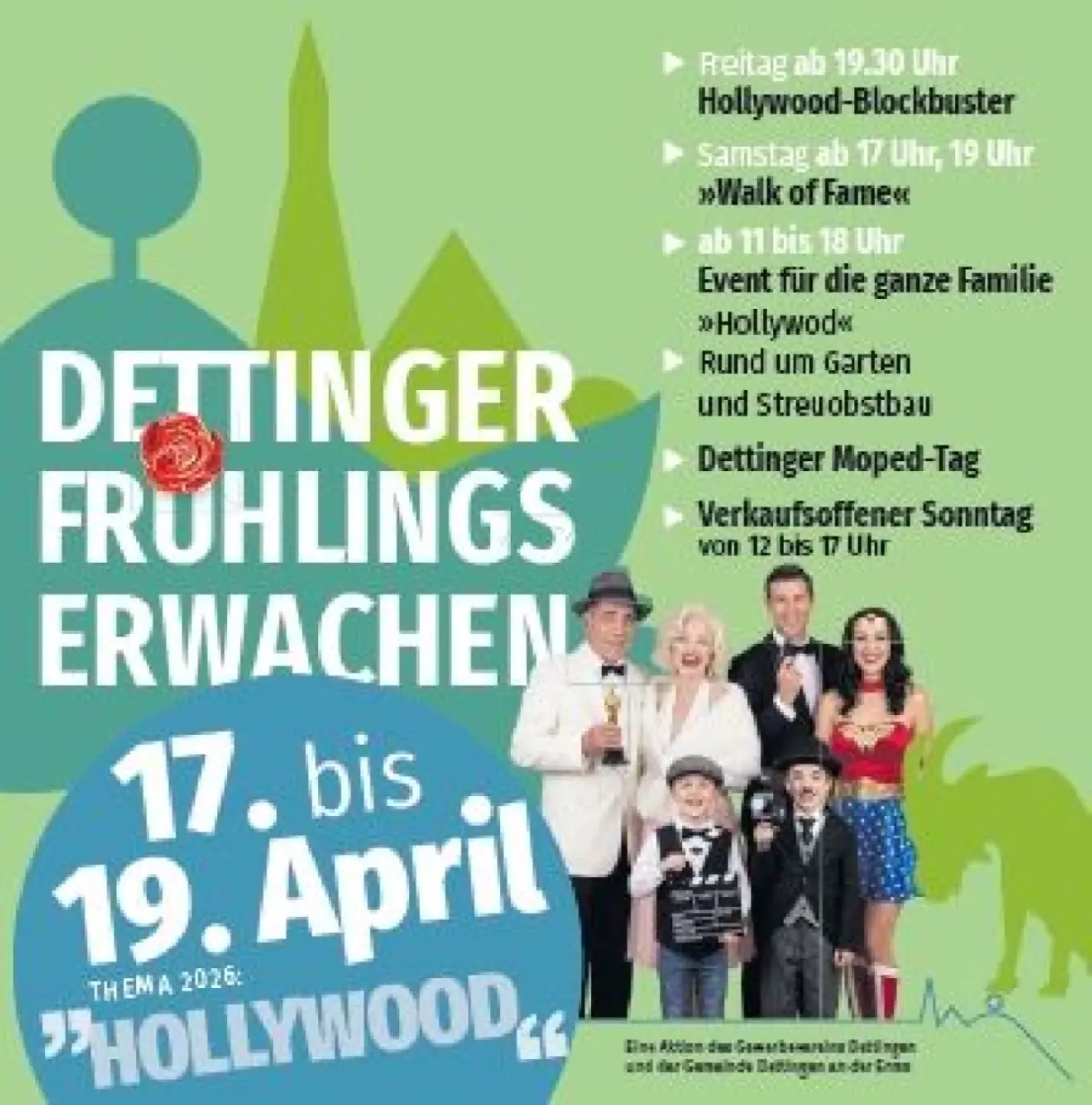 Wenn sich der Marktplatz in Dettingen an der Erms in eine völlig neue Welt verwandelt, dann ist wieder Frühlingserwachen. Jahr für Jahr begeistert die Veranstaltung mit einer aufwendig gestalteten Themenkulisse – und genau dafür ist sie weit über die Ortsgrenzen hinaus bekannt. Von Freitag, 17., bis Sonntag, 19. April, heißt es nun: Vorhang auf für Hollywood.