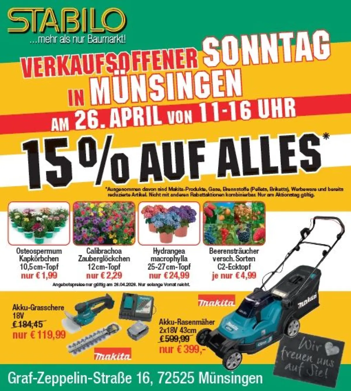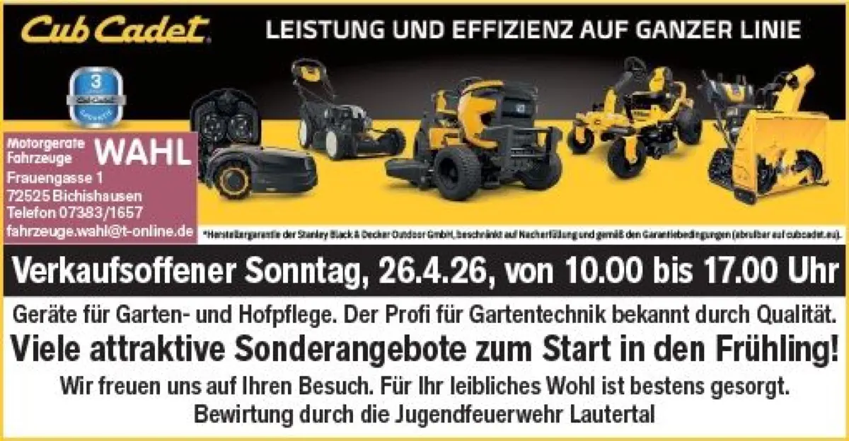 Wer seinen Garten frisch machen will, ist beim STABILO Baumarkt richtig. Dort gibt es am 26. April 15 Prozent Rabatt auf viele Produkte. Wer sich für professionelle Geräte für Garten- und Hofpflege interessiert, sollte beim Motorgerätehändler WAHL vorbeischauen. Auch hier gibt es viele attraktive Sonderangebote zum Frühlingsstart. Zudem sorgt hier die Jugendfeuerwehr Lautertal für das leibliche Wohl.