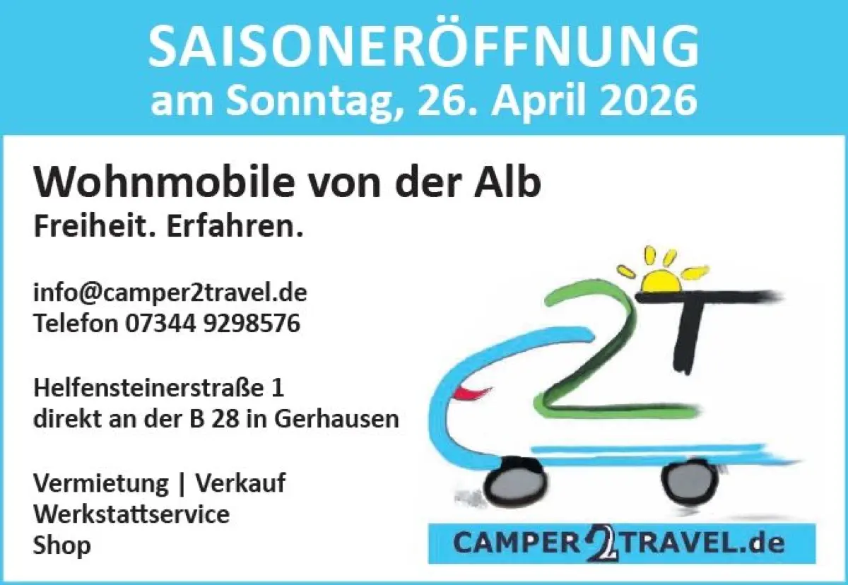 Foto: Margot Autenrieth-KronenthalerAm kommenden Sonntag, dem 26. April, ist es soweit. Die Saisoneröffnung 2026 steht bei der Firma Camper2Travel in Gerhausen in der Helfensteinerstraße 1 an. Mit einem Tag der offenen Tür von 10 bis 17 Uhr sowie einem kleinen Fest mit Bewirtung durch den Verein „d’Gerhauser“ wollen die beiden Firmeninhaber Roland Schweizer und Stefan Leyk gemeinsam mit ihren Kunden und Besuchern den Saisonauftakt feiern.