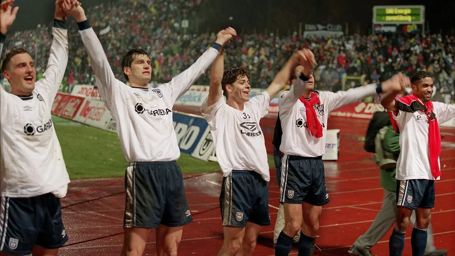 Kurz vor Weihnachten 1999 feierten (v.l.) David Zdrilic, Joachim Stadler, Leandro Fonseca, Rainer Scharinger und ihre Ulmer Mitspieler in der Bundesliga einen 3:0-Coup gegen Eintracht Frankfurt