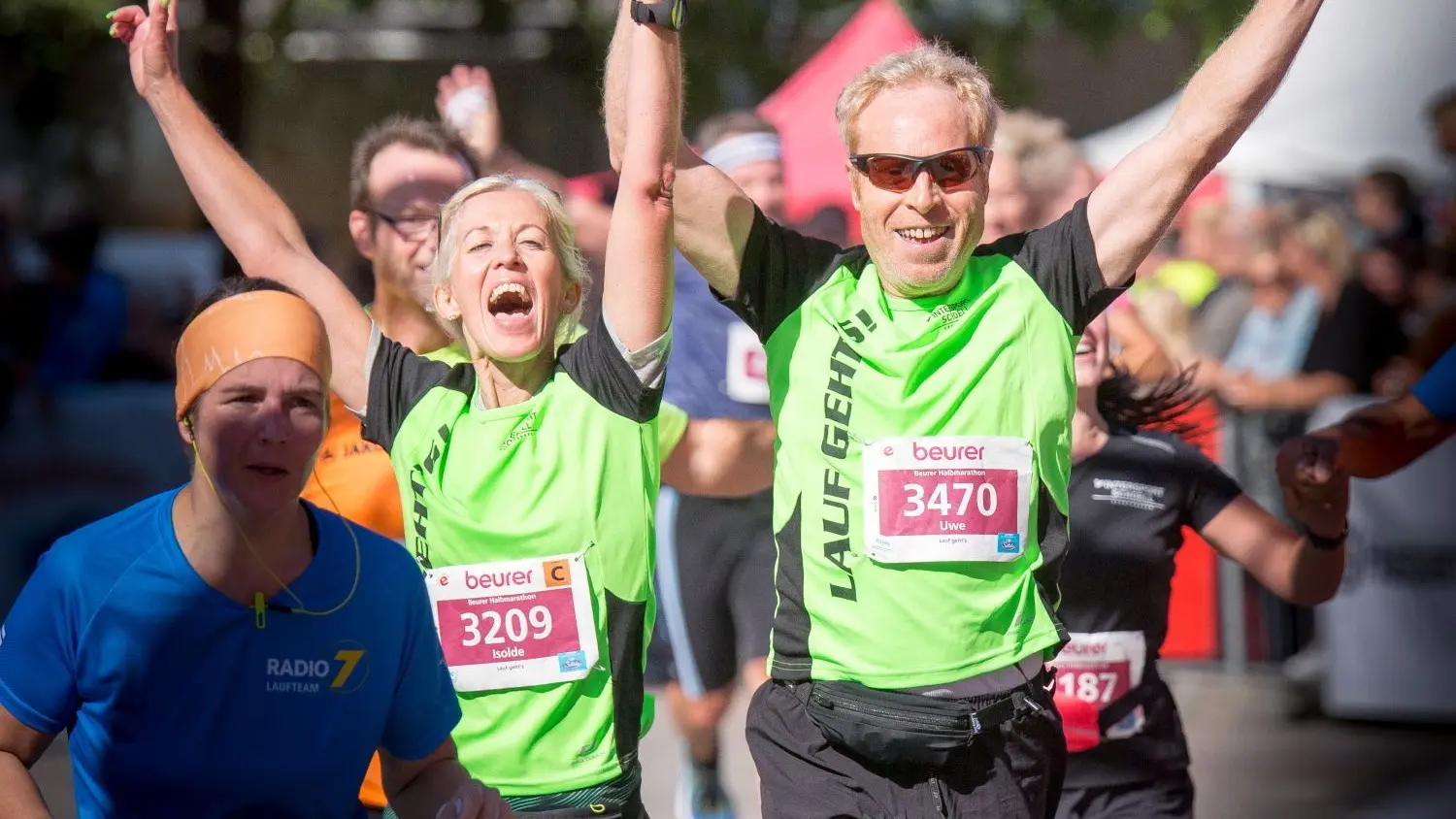 Grenzenlose Freude: Beim Halbmarathon Ende September 2019 in Ulm überquerten die Lauf-geht’s-Teilnehmer Isolde Hammer und Uwe Schaaf gemeinsam die Ziellinie. In diesem Jahr gibt es bei der Aktion in Gaildorf eine Walking-Gruppe. ⇥