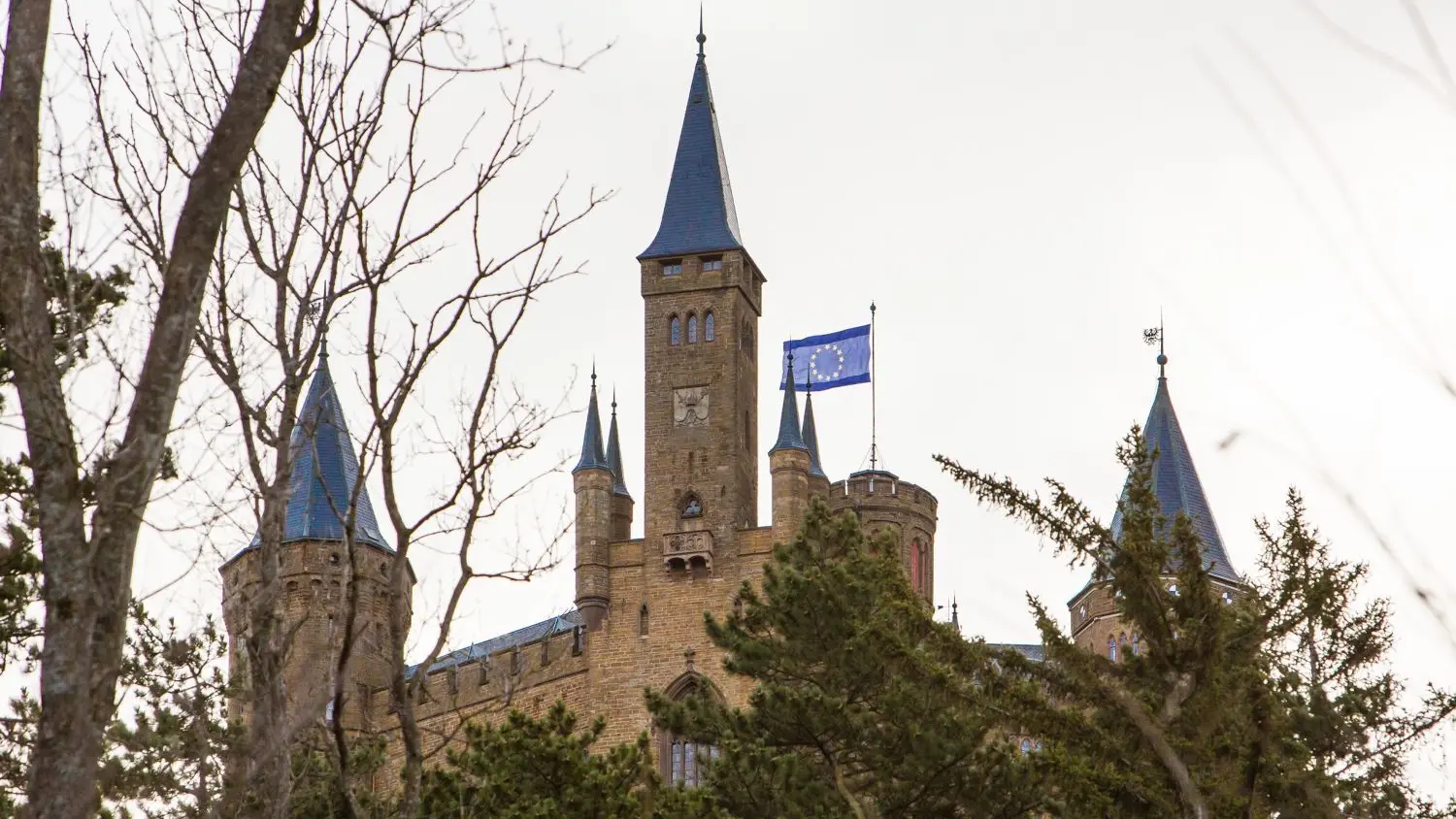Die Europa-Flagge steht seit Freitagmorgen auf der Burg Hohenzollern im Wind.