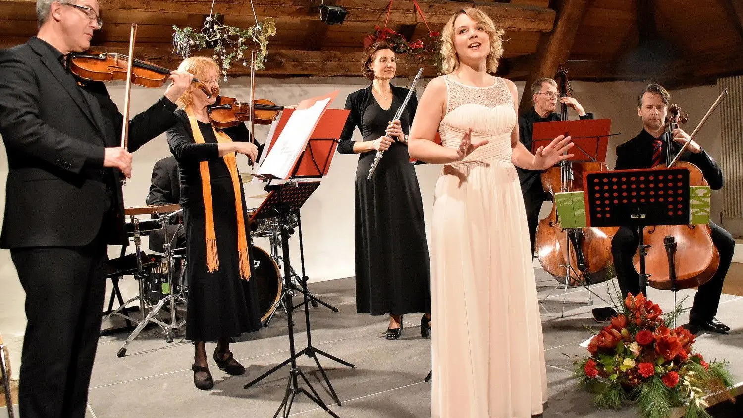 Heiterer Jahresanfang beim gelungenen Neujahrskonzert in vollbesetzter historischer Kelter mit Sopranistin Larissa Wäspy und der Nürtinger Salonmusik.