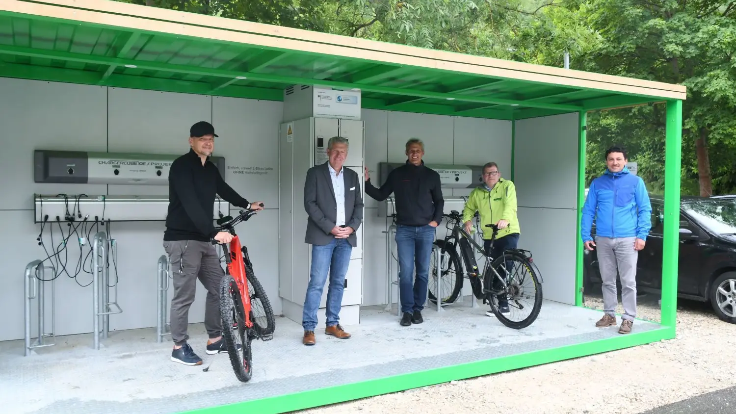Freuen sich über den zweiten Charger-Cube auf Münsinger Gemarkung (von links): Sascha Pieper, Klaus Fischer, Bernhard Schneider, Mike Münzing und Hans-Peter Engelhart. Die Station wurde jetzt in Buttenhausen auf dem Parkplatz beim Café Ikarus installiert.