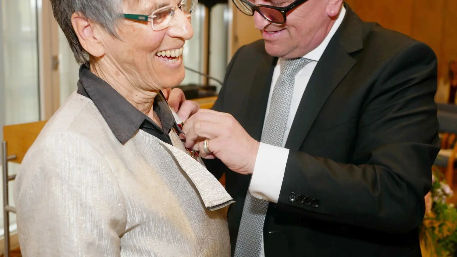 Baden-Württembergs Sozialminister Manne Lucha zeichnet in der VHS Prof. Monika Barz mit dem Bundesverdienstkreuz aus.